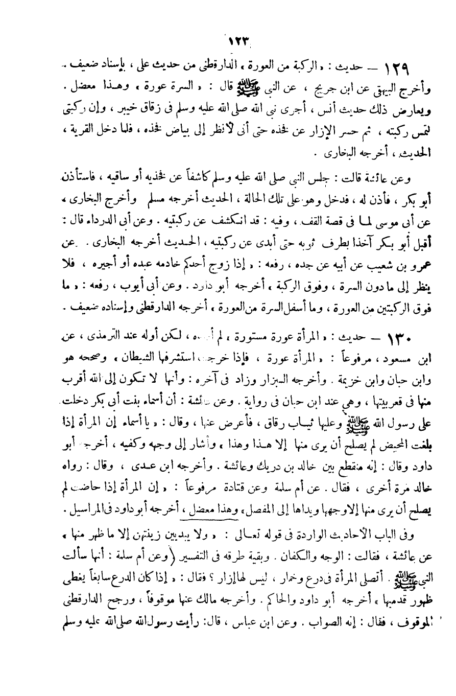 129 - حَدِيث الرّكْبَة من الْعَوْرَة الدَّارَقُطْنِيّ من حَدِيث عَلّي بِإِسْنَاد ضَعِيف وَأخرج الْبَيْهَقِيّ عَن ابْن جريج عَن النَّبِي صَلَّى اللَّهُ عَلَيْهِ وَسَلَّم َ قَالَ السُّرَّة عَورَة وَهَذَا معضل ويعارض ذَلِك حَدِيث أنس أَجْرَى نَبِي الله صَلَّى اللَّهُ عَلَيْهِ وَسَلَّم َ فِي زقاق خَيْبَر وَإِن ركبتي لتمس ركبته ثمَّ حسر الْإِزَار عَن فَخذه حَتَّى أَنِّي لأنظر إِلَى بَيَاض فَخذه فَلَمَّا دخل الْقرْيَة الحَدِيث أخرجه البُخَارِيّ