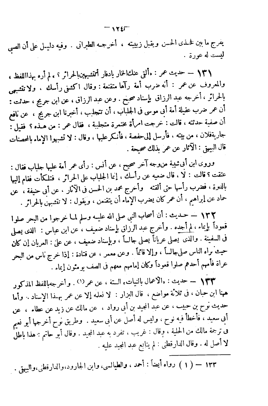 131 - حَدِيث عمر ألقِي عَنْك الْخمار يَا دفار أتتشبهين بالحرائر لم أره بِهَذَا اللَّفْظ وَالْمَعْرُوف عَن عمر أَنه ضرب أمة رَآهَا مقنعة وَقَالَ اكشفي رَأسك وَلَا تتشبهي بالحرائر أخرجه عبد الرَّزَّاق بِإِسْنَاد صَحِيح وَعَن عبد الرَّزَّاق عَن ابْن جريج حدثت أَن عمر ضرب عقيلة أمة أبي مُوسَى فِي الجلباب أَن تتجلبب أخبرنَا ابْن جريج عَن نَافِع أَن صَفِيَّة حدثته قَالَت خرجت امْرَأَة مختمرة متجلببة فَقَالَ عمر من هَذِه فَقيل جَارِيَة فلَان من بَيته فَأرْسل إِلَى حَفْصَة فَأنْكر عَلَيْهَا وَقَالَ لَا تشبهوا الْإِمَاء بالمحصنات قَالَ الْبَيْهَقِيّ الْآثَار عَن عمر بذلك صَحِيحَة