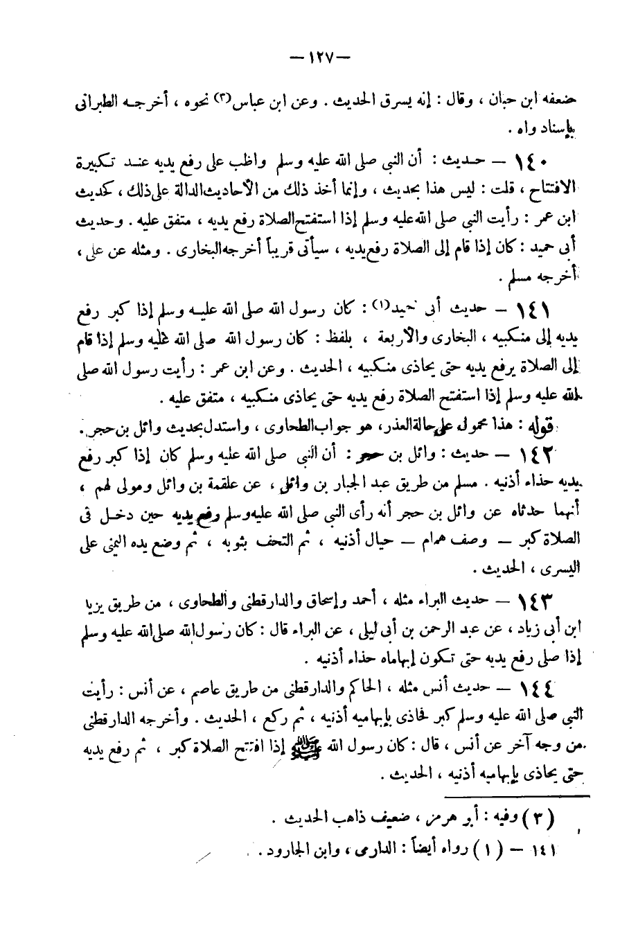143 - حَدِيث الْبَراء مثله أَحْمد وَإِسْحَاق وَالدَّارَقُطْنِيّ والطَّحَاوِي من طَرِيق يزِيد ابْن أبي زِيَاد عَن عبد الرَّحْمَن بن أبي لَيْلَى عَن الْبَراء قَالَ كَانَ رَسُول الله صَلَّى اللَّهُ عَلَيْهِ وَسَلَّم َ إِذا صَلَّى رفع يَدَيْهِ حَتَّى تكون إبهاماه حذاء أُذُنَيْهِ