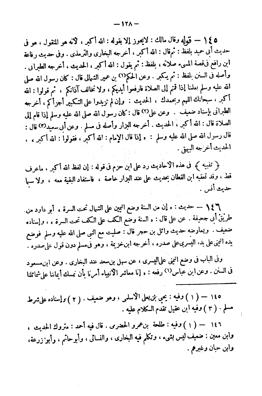 145 - قَوْله وَقَالَ مَالك لايجوز إِلَّا بقوله الله أكبر لِأَنَّهُ هُوَ الْمَنْقُول هُوَ فِي حَدِيث أبي حميد بِلَفْظ ثمَّ قَالَ الله أكبر أخرجه البُخَارِيّ وَالتِّرْمِذِيّ وَفِي الحَدِيث رِفَاعَة ابْن رَافع فِي قصَّة المسىء صلَاته بِلَفْظ ثمَّ يَقُول الله أكبر الحَدِيث أخرجه الطَّبَرَانِيّ وَأَصله فِي السّنَن بِلَفْظ ثمَّ يكبر وَعَن الحكم بن عُمَيْر الشمالي قَالَ كَانَ رَسُول الله صَلَّى اللَّهُ عَلَيْهِ وَسَلَّم َ يعلمنَا إِذا قُمْتُم إِلَى الصَّلَاة فارفعوا أَيْدِيكُم وَلَا تخَالف آذانكم ثمَّ قُولُوا الله أكبر سُبْحَانَكَ اللَّهُمَّ وَبِحَمْدِك الحَدِيث وَإِن لم تَزِيدُوا عَلَى التَّكْبِير أجزأكم أخرجه الطَّبَرَانِيّ بِإِسْنَاد ضَعِيف وَعَن عَلّي قَالَ كَانَ رَسُول الله صَلَّى اللَّهُ عَلَيْهِ وَسَلَّم َ إِذا قَامَ إِلَى الصَّلَاة قَالَ الله أكبر الحَدِيث أخرجه الْبَزَّار وَأَصله فِي مُسلم وَعَن أبي سعيد قَالَ قَالَ رَسُول الله صَلَّى اللَّهُ عَلَيْهِ وَسَلَّم َ إِذا قَالَ الإِمَام الله أكبر فَقَلُّوا الله أكبر الحَدِيث أخرجه الْبَيْهَقِيّ