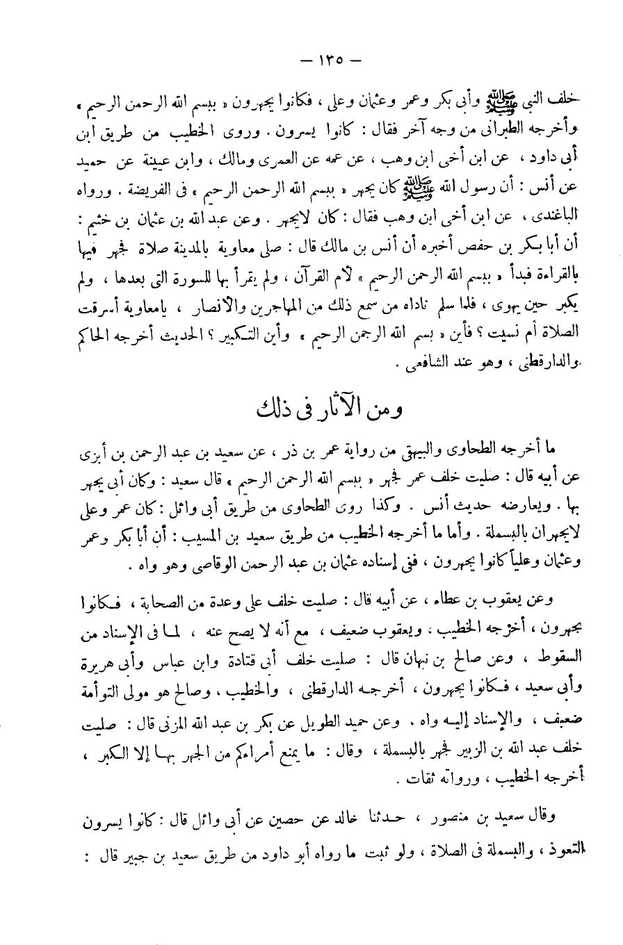 مَا أخرجه الطَّحَاوِيّ وَالْبَيْهَقِيّ من رِوَايَة عمر بن ذَر عَن سعيد بن عبد الرَّحْمَن بن أَبْزي عَن أَبِيه قَالَ صليت خلف عمر فجهر بِبسْم الله الرَّحْمَن الرَّحِيم قَالَ سعيد وَكَانَ أبي يجْهر بهَا ويعارضه حَدِيث أنس وَكَذَا رَوَى الطَّحَاوِيّ من طَرِيق أبي وَائِل كَانَ عمر وَعلي لَا يجهران بالبسملة وَأما مَا أخرجه الْخَطِيب من طَرِيق سعيد بن الْمسيب أَن أَبَا بكر وَعمر وَعُثْمَان وعليا كَانُوا يجهرون فَفِي إِسْنَاده عُثْمَان بن عبد الرَّحْمَن الوقاصي وَهُوَ واه