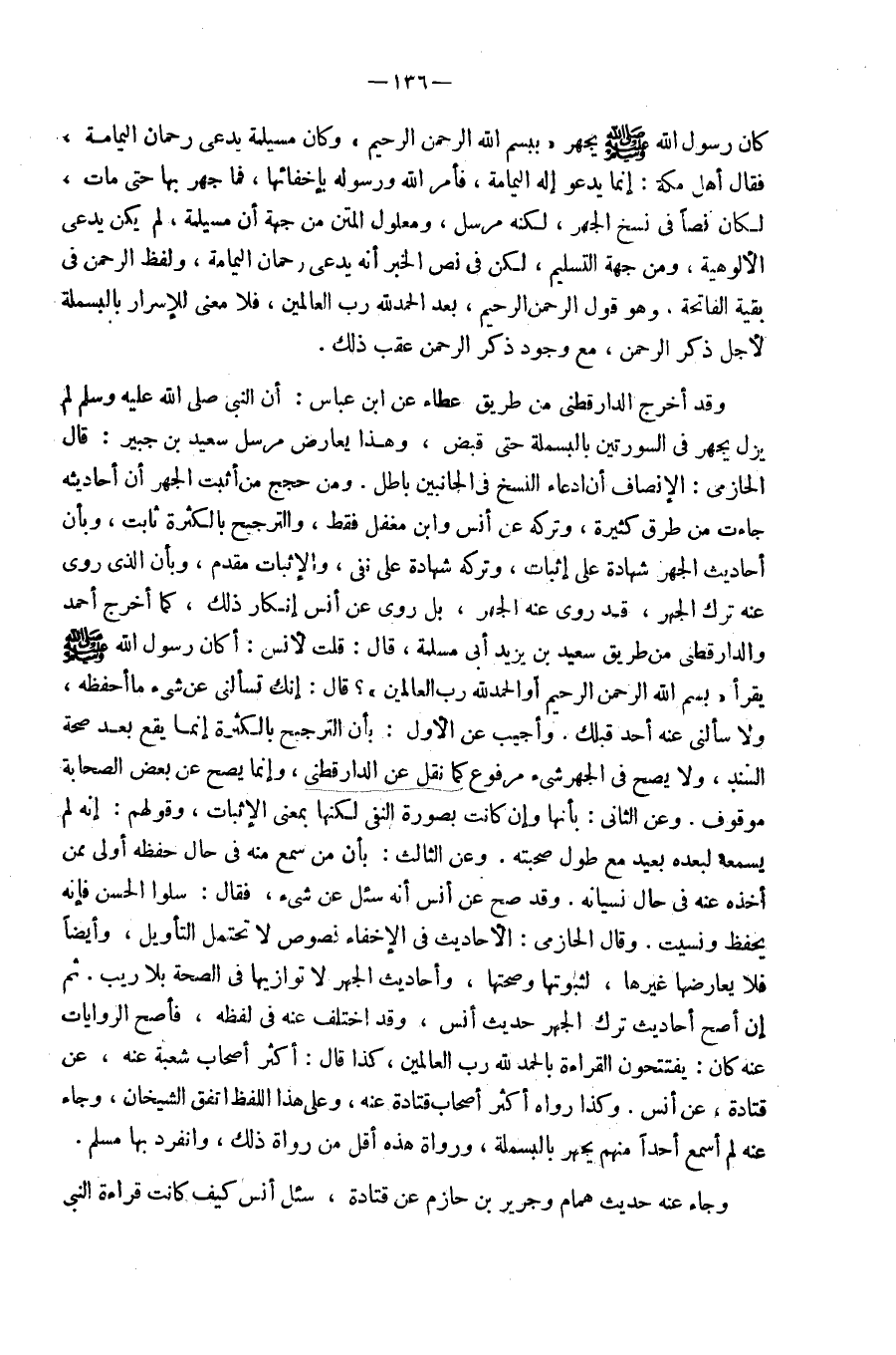 وَقد أخرج الدَّارَقُطْنِيّ من طَرِيق عَطاء عَن ابْن عَبَّاس أَن النَّبِي صَلَّى اللَّهُ عَلَيْهِ وَسَلَّم َ لم يزل يجْهر فِي السورتين بالبسملة حَتَّى قبض وَهَذَا يُعَارض مُرْسل سعيد بن جُبَير قَالَ الْحَازِمِي الْإِنْصَاف أَن إدعاء النّسخ فِي الْجَانِبَيْنِ بَاطِل وَمن حجج من أثبت الْجَهْر أَن أَحَادِيثه جَاءَت من طرق كَثِيرَة وَتَركه عَن أنس وَابْن مُغفل فَقَط وَالتَّرْجِيح بِالْكَثْرَةِ ثَابت وَبِأَن أَحَادِيث الْجَهْر شَهَادَة عَلَى إِثْبَات وَتَركه شَهَادَة عَلَى نفي وَالْإِثْبَات مقدم وَبِأَن الَّذِي رَوَى عَنهُ ترك الْجَهْر قد رَوَى عَنهُ الْجَهْر بل رَوَى عَن أنس إِنْكَار ذَلِك كَمَا أخرجه أَحْمد وَالدَّارَقُطْنِيّ من طَرِيق سعيد بن يزِيد أبي مسلمة قَالَ قلت لأنس أَكَانَ رَسُول الله صَلَّى اللَّهُ عَلَيْهِ وَسَلَّم َ يقْرَأ بِسم الله الرَّحْمَن الرَّحِيم أَو الْحَمد لله رب الْعَالمين قَالَ إِنَّك تَسْأَلنِي عَن شَيْء مَا أحفظه ولاسألني عَن أحد قبلك وَأجِيب عَن الأول بِأَن التَّرْجِيح بِالْكَثْرَةِ إِنَّمَا يَقع بعد صِحَة السَّنَد ولايصح فِي الْجَهْر شَيْء مَرْفُوع كَمَا نقل عَن الدَّارَقُطْنِيّ وَإِنَّمَا يَصح عَن بعض الصَّحَابَة مَوْقُوف وَعَن الثَّانِي بِأَنَّهَا وَإِن كَانَت بِصُورَة النَّفْي لَكِنَّهَا بِمَعْنى الْإِثْبَات وَقَوْلهمْ إِنَّه لم يسمعهُ لبعده بعيد مَعَ طول صحبته وَعَن الثَّالِث بِأَن من سمع مِنْهُ فِي حَال حفظه أولَى من أَخذه عَنهُ فِي حَال نسيانه وَقد صَحَّ عَن أنس أَنه سُئِلَ عَن شَيْء فَقَالَ سلوا الْحسن فَإِنَّهُ يحفظ ونسيت وَقَالَ الْحَازِمِي الْأَحَادِيث فِي الْإخْفَاء نُصُوص لَا تحْتَمل التَّأْوِيل وَأَيْضًا فَلَا يعارضها غَيرهَا لثبوتها وصحتها وَأَحَادِيث الْجَهْر لَا توازيها فِي الصِّحَّة بِلَا ريب ثمَّ إِن أصح أَحَادِيث ترك الْجَهْر حَدِيث أنس وَقد اخْتلف عَنهُ فِي لَفظه فأصح الرِّوَايَات عَنهُ كَانَ يفتتحون الْقِرَاءَة بِالْحَمْد لله رب الْعَالمين كَذَا قَالَ أَكثر أَصْحَاب شُعْبَة عَنهُ عَن قَتَادَة عَن أنس وَكَذَا رَوَاهُ أَكثر أَصْحَاب قَتَادَة عَنهُ وَعَلَى هَذَا اللَّفْظ اتّفق الشَّيْخَانِ وَجَاء عَنهُ لم أسمع أحدا مِنْهُم يجْهر بالبسملة ورواة هَذِه أقل من رُوَاة ذَلِك وَانْفَرَدَ بهَا مُسلم