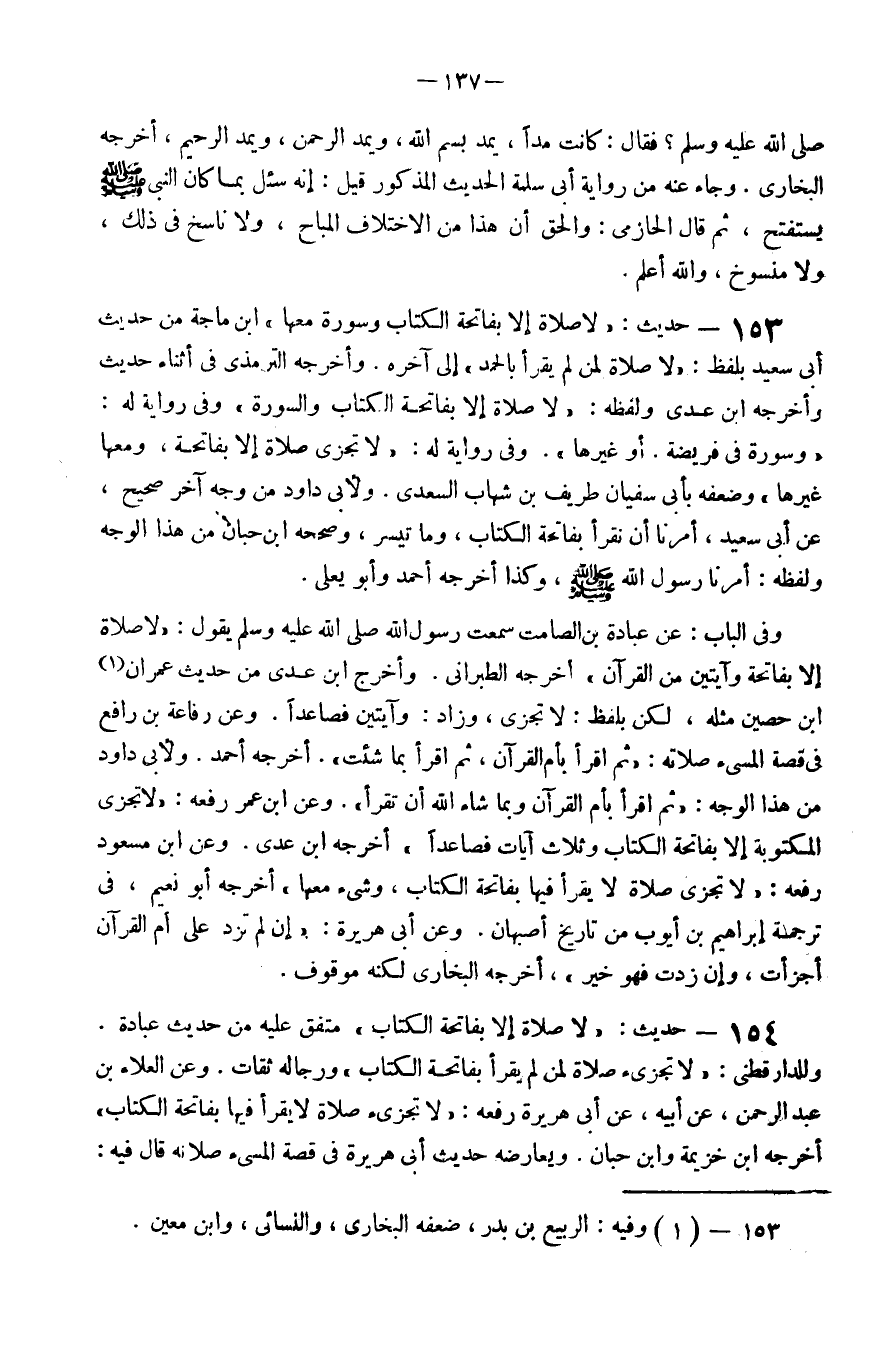 154 - حَدِيث لَا صَلَاة إِلَّا بِفَاتِحَة الْكتاب مُتَّفق عَلَيْهِ من حَدِيث عبَادَة وللدارقطني لَا تُجزئ صَلَاة لمن لم يقْرَأ بِفَاتِحَة الْكتاب وَرِجَاله ثِقَات وَعَن الْعَلَاء بن عبد الرَّحْمَن عَن أَبِيه عَن أبي هُرَيْرَة رَفعه لَا تُجزئ صَلَاة لَا يقْرَأ فِيهَا بِفَاتِحَة الْكتاب أخرجه ابْن خُزَيْمَة وَابْن حبَان ويعارضه حَدِيث أبي هُرَيْرَة فِي قصَّة المسئ صلَاته قَالَ فِيهِ