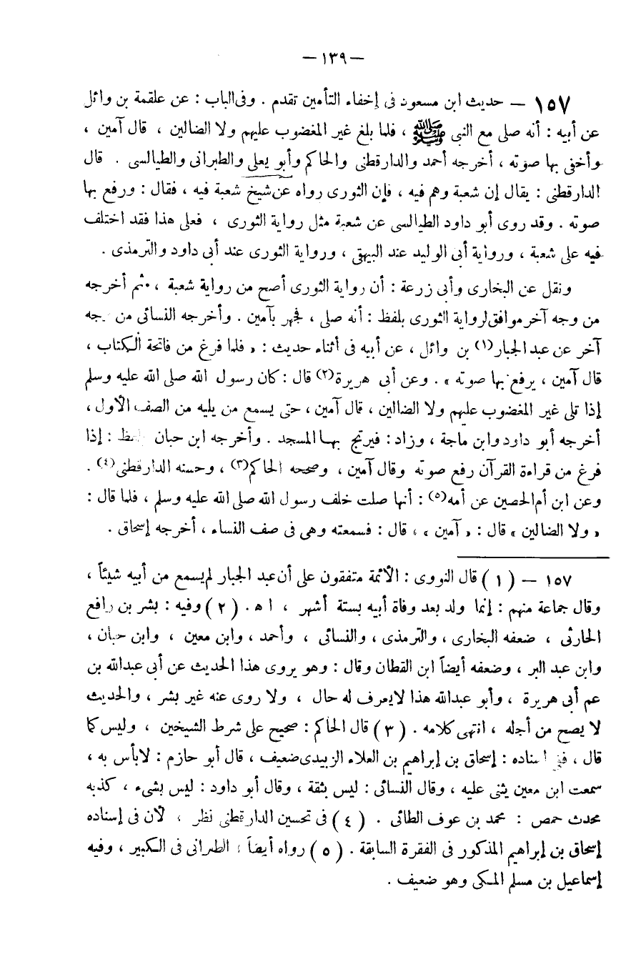 157 - حَدِيث ابْن مَسْعُود فِي إخفاء التأميم تقدم وَفِي الْبَاب عَن عَلْقَمَة بن وَائِل عَن أَبِيه أَنه صَلَّى مَعَ النَّبِي صَلَّى اللَّهُ عَلَيْهِ وَسَلَّم َ فَلَمَّا بلغ غير المغضوب عَلَيْهِم وَلَا الضَّالّين قَالَ آمين وأخفى بهَا صَوته أخرجه أَحْمد وَالدَّارَقُطْنِيّ وَالْحَاكِم وَأَبُو يعلي وَالطَّبَرَانِيّ وَالطَّيَالِسِي قَالَ الدَّارَقُطْنِيّ يُقَال إِن شُعْبَة وهم فِيهِ فَإِن الثَّوْريّ رَوَاهُ عَن الشَّيْخ شُعْبَة فِيهِ فَقَالَ وَرفع بهَا صَوته وَقد رَوَى أَبُو دَاوُد الطَّيَالِسِيّ عَن شُعْبَة مثل رِوَايَة الثَّوْريّ فعلَى هَذَا فقد اخْتلف فِيهِ عَلَى شُعْبَة وَرِوَايَة أبي الْوَلِيد عِنْد الْبَيْهَقِيّ وَرِوَايَة الثَّوْريّ عِنْد أبي دَاوُد وَالتِّرْمِذِيّ