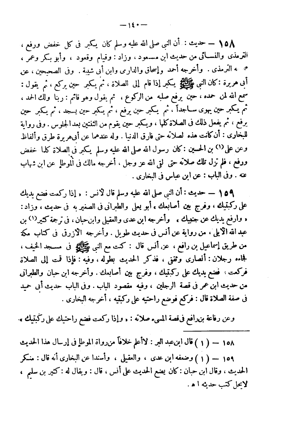 158 - حَدِيث أَن النَّبِي صَلَّى اللَّهُ عَلَيْهِ وَسَلَّم َ كَانَ يكبر فِي كل خفض وَرفع التِّرْمِذِيّ وَالنَّسَائِيّ من حَدِيث ابْن مَسْعُود وَزَاد وَقيام وقعود وَأَبُو بكر وَعمر صَححهُ التِّرْمِذِيّ وَأخرجه أَحْمد وَإِسْحَاق والدارمي وَابْن أبي شيبَة وَفِي الصَّحِيحَيْنِ عَن أبي هُرَيْرَة كَانَ النَّبِي صَلَّى اللَّهُ عَلَيْهِ وَسَلَّم َ يكبر إِذا قَامَ إِلَى الصَّلَاة ثمَّ يكبر حِين يرْكَع ثمَّ يَقُول سمع الله لمن حَمده حِين يرفع صلبه من الرُّكُوع ثمَّ يَقُول وَهُوَ قَائِم رَبنَا وَلَك الْحَمد ثمَّ يكبر حِين يهوي سَاجِدا ثمَّ يكبر حِين يرفع ثمَّ يكبر حِين يسْجد ثمَّ يكبر حِين يرفع ثمَّ يفعل ذَلِك فِي الصَّلَاة كلهَا وَيكبر حِين يقوم من الثِّنْتَيْنِ بعد الْجُلُوس وَفِي رِوَايَة للْبُخَارِيّ أَن كَانَت هَذِه لصلاته حَتَّى فَارق الدُّنْيَا وَله عِنْدهمَا عَن أبي هُرَيْرَة طرق والفاظ وَعَن عَلّي بن الْحُسَيْن كَانَ رَسُول الله صَلَّى اللَّهُ عَلَيْهِ وَسَلَّم َ يكبر فِي الصَّلَاة كلما خفض وَرفع فَلم تزل تِلْكَ صلَاته حَتَّى لَقِي الله عَزَّ وَجَلَّ أخرجه مَالك فِي الْمُوَطَّإِ عَن ابْن شهَاب عَنهُ وَفِي الْبَاب عَن ابْن عَبَّاس فِي البُخَارِيّ