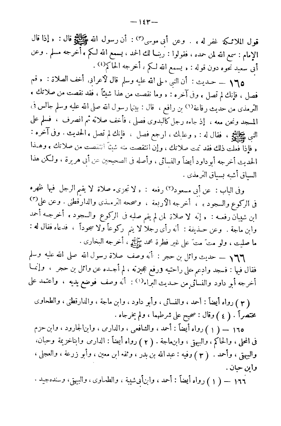 165 - حَدِيث أَن النَّبِي صَلَّى اللَّهُ عَلَيْهِ وَسَلَّم َ قَالَ لأعرابي أخف الصَّلَاة قُم فصل فَإنَّك لم تصل وَفِي آخِره وَمَا نقصت من هَذَا شَيْئا فقد نقصت من صَلَاتك التِّرْمِذِيّ من حَدِيث رِفَاعَة بن رَافع قَالَ بَيْنَمَا رَسُول الله صَلَّى اللَّهُ عَلَيْهِ وَسَلَّم َ جَالس فِي الْمَسْجِد وَنحن مَعَه إِذْ جَاءَهُ رجل كالبدوي فَصَلى فأخف صلَاته ثمَّ انْصَرف فَسلم عَلَى النَّبِي صَلَّى اللَّهُ عَلَيْهِ وَسَلَّم َ فَقَالَ لَهُ وَعَلَيْك ارْجع فصل فَإنَّك لم تصل الحَدِيث وَفِي آخِره فَإِذا فعلت ذَلِك فقد تمت صَلَاتك وَإِن انتقصت مِنْهُ شَيْئا انتقصت من صَلَاتك وَهَذَا الحَدِيث أخرجه أَبُو دَاوُد أَيْضا وَالنَّسَائِيّ وَأَصله فِي الصَّحِيحَيْنِ عَن أبي هُرَيْرَة وَلَكِن هَذَا السِّيَاق أشبه بسياق التِّرْمِذِيّ