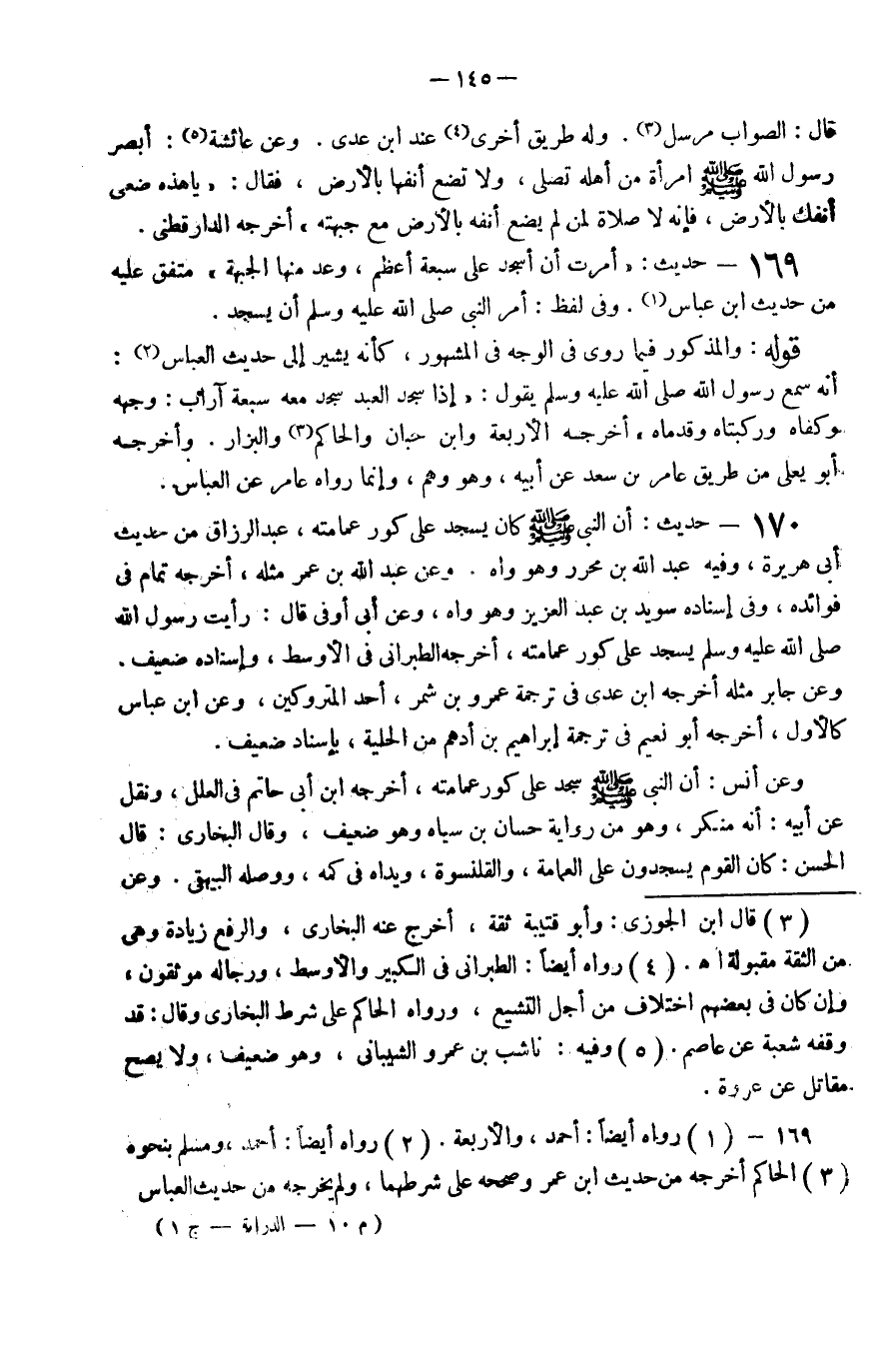170 - حَدِيث أَن النَّبِي صَلَّى اللَّهُ عَلَيْهِ وَسَلَّم َ كَانَ يسْجد عَلَى كور عمَامَته عبد الرَّزَّاق من حَدِيث أبي هُرَيْرَة وَفِيه عبد الله بن مُحَرر وَهُوَ واه وَعَن عبد الله بن عمر مثله أخرجه تَمام فِي فَوَائده وَفِي إِسْنَاده سُوَيْد بن عبد الْعَزِيز وَهُوَ واه عَن أبي أوفي قَالَ رَأَيْت رَسُول الله صَلَّى اللَّهُ عَلَيْهِ وَسَلَّم َ يسْجد عَلَى كور عمَامَته أخرجه الطَّبَرَانِيّ فِي الْأَوْسَط وَإِسْنَاده ضَعِيف وَعَن جَابر مثله أخرجه ابْن عدي فِي تَرْجَمَة عَمْرو بن شمر أَحْمد المتروكين وَعَن ابْن عَبَّاس كَالْأولِ أخرجه أَبُو نعيم فِي تَرْجَمَة إِبْرَاهِيم بن أدهم من الْحِلْية بِإِسْنَاد ضَعِيف
