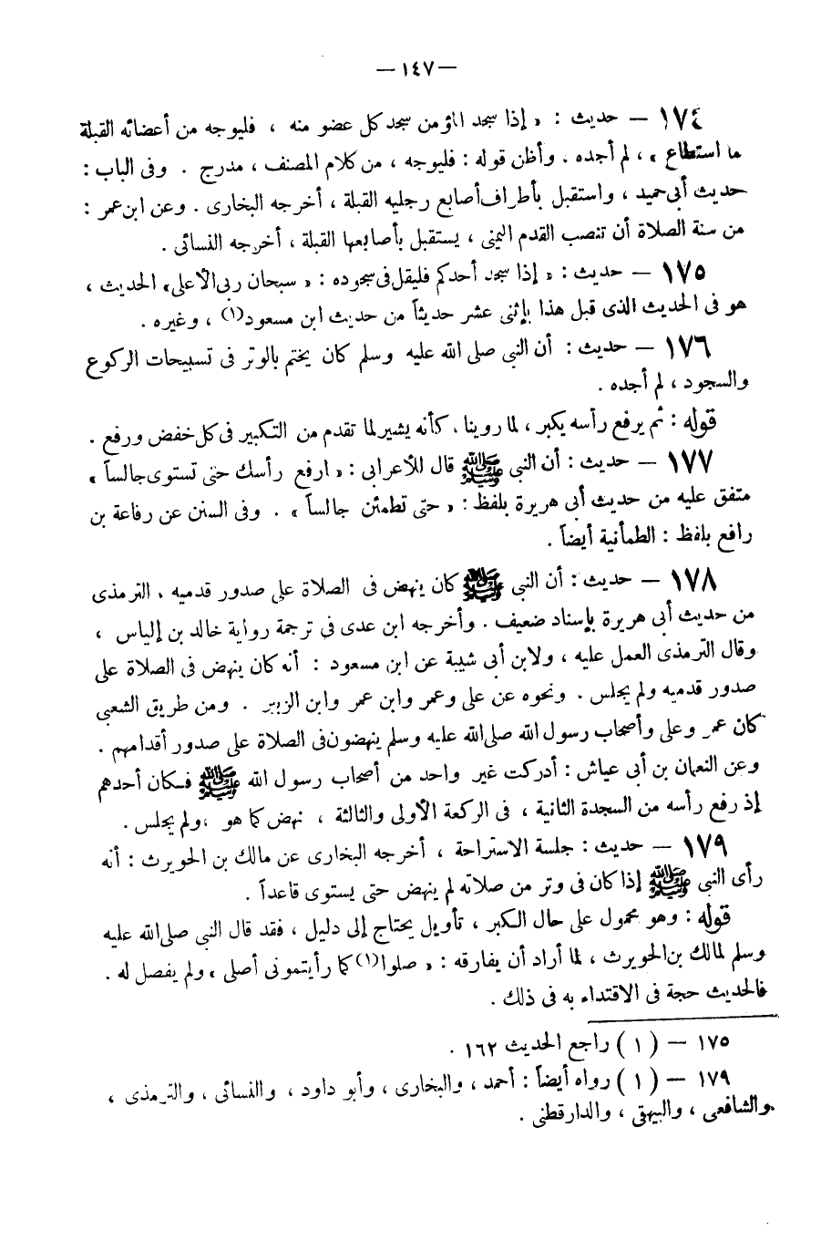 177 - حَدِيث أَن النَّبِي صَلَّى اللَّهُ عَلَيْهِ وَسَلَّم َ قَالَ للأعرابي ارْفَعْ رَأسك حَتَّى تستوي جَالِسا مُتَّفق عَلَيْهِ من حَدِيث أبي هُرَيْرَة بِلَفْظ حَتَّى تطمئِن جَالِسا وَفِي السّنَن عَن رِفَاعَة بن رَافع بِلَفْظ الطمأنية أَيْضا