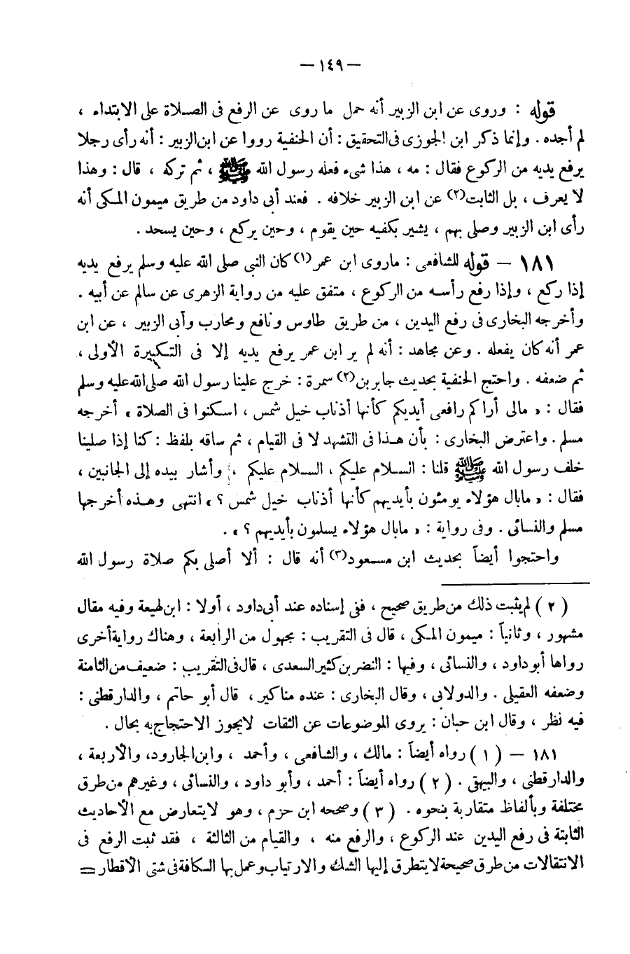 181 - قَوْله للشَّافِعِيّ مَا رَوَى ابْن عمر كَانَ النَّبِي صَلَّى اللَّهُ عَلَيْهِ وَسَلَّم َ يرفع يَدَيْهِ إِذا ركع وَإِذا رفع رَأسه من الرُّكُوع مُتَّفق عَلَيْهِ من رِوَايَة الزُّهْرِيّ عَن سَالم عَن أَبِيه وَأخرجه البُخَارِيّ فِي رفع الْيَدَيْنِ من طَرِيق طَاوس وَنَافِع ومحارب وَأبي الزبير عَن ابْن عمر أَنه كَانَ يَفْعَله وَعَن مُجَاهِد أَنه لم ير ابْن عمر يرفع يَدَيْهِ إِلَّا فِي التكبيره الأولَى ثمَّ ضعفه وَاحْتج الْحَنَفِيَّة بِحَدِيث جَابر بن سَمُرَة خرج علينا رَسُول الله صَلَّى اللَّهُ عَلَيْهِ وَسَلَّم َ فَقَالَ مَالِي أَرَاكُم رافعي أَيْدِيكُم كَأَنَّهَا أَذْنَاب خيل شمس اسكنوا فِي الصَّلَاة أخرجه مُسلم وَاعْترض البُخَارِيّ بِأَن هَذَا فِي التَّشَهُّد لَا فِي الْقيام ثمَّ سَاقه بِلَفْظ كُنَّا إِذا صلينَا خلف رَسُول الله صَلَّى اللَّهُ عَلَيْهِ وَسَلَّم َ قُلْنَا السَّلَام عَلَيْكُم السَّلَام عَلَيْكُم وَأَشَارَ بِيَدِهِ إِلَى الْجَانِبَيْنِ فَقَالَ مابال هَؤُلَاءِ يومئون بِأَيْدِيهِم كَأَنَّهَا أَذْنَاب خيل شمس انْتَهَى وَهَذِه أخرجهَا مُسلم وَالنَّسَائِيّ وَفِي رِوَايَة مابال هَؤُلَاءِ يسلمُونَ بِأَيْدِيهِم