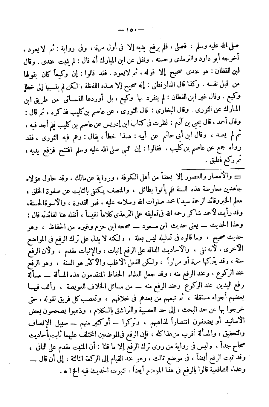 رَسُول الله صَلَّى اللَّهُ عَلَيْهِ وَسَلَّم َ فَصَلى فَلم يرفع يَدَيْهِ إِلَّا فِي أول مرّة وَفِي رِوَايَة ثمَّ لَا يعود أخرجه أَبُو دَاوُد وَالتِّرْمِذِيّ وَحسنه وَنقل عَن ابْن الْمُبَارك أَنه قَالَ لم يثبت عِنْدِي وَقَالَ ابْن القظان هُوَ عِنْدِي صَحِيح إِلَّا قَوْله ثمَّ لَا يعود فقد قَالُوا إِن وكيعا كَانَ يَقُولهَا من قبل نَفسه وَكَذَا قَالَ الدَّارَقُطْنِيّ إِنَّه صَحِيح إِلَّا هَذِه اللَّفْظَة لَكِن لم ينسبها إِلَى خطإ وَكِيع وَقَالَ غير ابْن الْقطَّان لم ينْفَرد بهَا وَكِيع بل أوردهَا النَّسَائِيّ من طَرِيق ابْن الْمُبَارك عَن الثَّوْريّ وَقَالَ البُخَارِيّ قَالَ الثَّوْريّ عَن عَاصِم بن كُلَيْب فَذكره ثمَّ قَالَ وَقَالَ أَحْمد قَالَ يحي بن آدم نظرت فِي كتاب ابْن إِدْرِيس عَن عَاصِم بن كُلَيْب فَلم أجد فِيهِ ثمَّ لم يعد وَقَالَ ابْن أبي حَاتِم عَن أَبِيه هَذَا خطأ يُقَال وهم فِيهِ الثَّوْريّ فقد رَوَاهُ جمع عَن عَاصِم بن كُلَيْب فَقَالُوا إِن النَّبِي صَلَّى اللَّهُ عَلَيْهِ وَسَلَّم َ افْتتح فَرفع يَدَيْهِ ثمَّ ركع فطبق