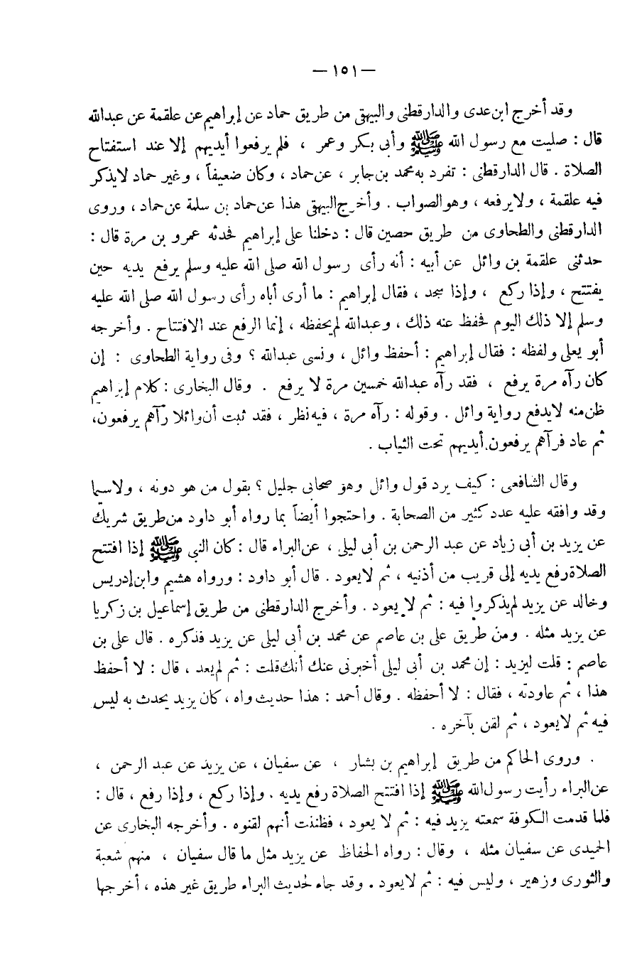 وَقد أخرج ابْن عدي وَالدَّارَقُطْنِيّ وَالْبَيْهَقِيّ من طَرِيق حَمَّاد عَن إِبْرَاهِيم عَن عَلْقَمَة عَن عبد الله قَالَ صليت مَعَ رَسُول الله صَلَّى اللَّهُ عَلَيْهِ وَسَلَّم َ وَأبي بكر وَعمر فَلم يرفعوا أَيْديهم إِلَّا عِنْد استفتاح الصَّلَاة قَالَ الدَّارَقُطْنِيّ تفرد بِهِ مُحَمَّد بن جَابر عَن حَمَّاد وَكَانَ ضَعِيفا وَغير حَمَّاد لَا يذكر فِيهِ عَلْقَمَة وَلَا يرفعهُ وَهُوَ الصَّوَاب وَأخرج الْبَيْهَقِيّ هَذَا عَن حَمَّاد بن سَلمَة عَن حَمَّاد وَرَوَى الدَّارَقُطْنِيّ والطَّحَاوِي من طَرِيق حُصَيْن قَالَ دَخَلنَا عَلَى إِبْرَاهِيم فحدثه عَمْرو بن مرّة قَالَ حَدثنِي عَلْقَمَة بن وَائِل عَن أَبِيه أَنه رَأَى رَسُول الله صَلَّى اللَّهُ عَلَيْهِ وَسَلَّم َ يرفع يَدَيْهِ حِين يفْتَتح وَإِذا ركع وَإِذا سجد فَقَالَ إِبْرَاهِيم مَا أرَى أَبَاهُ رَأَى رَسُول الله صَلَّى اللَّهُ عَلَيْهِ وَسَلَّم َ إِلَّا ذَلِك الْيَوْم فحفظ عَنهُ ذَلِك وَعبد الله لم يحفظه إِنَّمَا الرّفْع عِنْد الإفتتاح وَأخرجه أَبُو يعلي وَلَفظه فَقَالَ إِبْرَاهِيم أحفظ وَائِل وَنسي عبد الله وَفِي رِوَايَة الطَّحَاوِيّ إِن كَانَ رَآهُ مرّة يرفع فقد رَآهُ عبد الله خمسين مرّة لَا يرفع وَقَالَ البُخَارِيّ كَلَام إِبْرَاهِيم ظن مِنْهُ لَا يدْفع رِوَايَة وَائِل وَقَوله رَآهُ مرّة فِيهِ نظر فقد ثَبت أَن وائلا رَآهُمْ يرفعون ثمَّ عَاد فَرَآهُمْ يرفعون أَيْديهم تَحت الثِّيَاب