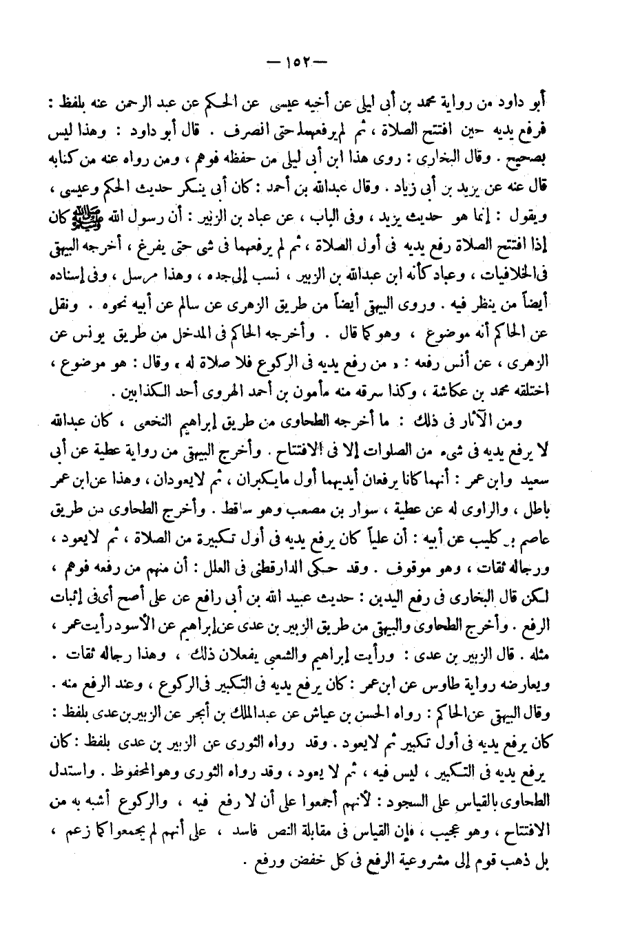 وَمن الْآثَار فِي ذَلِك مَا أخرجه الطَّحَاوِيّ من طَرِيق إِبْرَاهِيم النَّخعِيّ كَانَ عبد الله لَا يرفع يَدَيْهِ فِي شَيْء من الصَّلَوَات إِلَّا فِي الإفتتاح وَأخرج الْبَيْهَقِيّ من رِوَايَة عَطِيَّة عَن أبي سعيد وَابْن عمر أَنَّهُمَا كَانَا يرفعان أَيْدِيهِمَا أول مَا يكبران ثمَّ لَا يعودان وَهَذَا عَن ابْن عمر بَاطِل والراوي لَهُ عَن عَطِيَّة سوار بن مُصعب وَهُوَ سَاقِط وَأخرج الطَّحَاوِيّ من طَرِيق عَاصِم بن كُلَيْب عَن أَبِيه أَن عليا كَانَ يرفع يَدَيْهِ فِي أول تَكْبِيرَة من الصَّلَاة ثمَّ لَا يعود وَرِجَاله ثِقَات وَهُوَ مَوْقُوف وَقد حَكَى الدَّارَقُطْنِيّ فِي الْعِلَل أَن مِنْهُم من رَفعه فَوَهم لَكِن قَالَ البُخَارِيّ فِي رفع الْيَدَيْنِ حَدِيث عبيد الله بن أبي رَافع عَن عَلّي أصح أَي فِي إِثْبَات الرّفْع وَأخرج الطَّحَاوِيّ وَالْبَيْهَقِيّ من طَرِيق الزبير بن عدي عَن إِبْرَاهِيم عَن الْأسود رَأَيْت عمر مثله قَالَ الزبير بن عدي وَرَأَيْت إِبْرَاهِيم وَالشعْبِيّ يفْعَلَانِ ذَلِك وَهَذَا رِجَاله ثِقَات ويعارضه رِوَايَة طَاوس عَن ابْن عمر كَانَ يرفع يَدَيْهِ فِي التَّكْبِير فِي الرُّكُوع وَعند الرّفْع مِنْهُ وَقَالَ الْبَيْهَقِيّ عَن الْحَاكِم رَوَاهُ الْحسن بن عَيَّاش عَن عبد الْملك بن أبجر عَن الزبير بن عدي بِلَفْظ كَانَ يرفع يَدَيْهِ فِي أول تَكْبِير ثمَّ لَا يعود وَقد رَوَاهُ الثَّوْريّ عَن الزبير بن عدي بِلَفْظ كَانَ يرفع يَدَيْهِ فِي التَّكْبِير لَيْسَ فِيهِ ثمَّ لَا يعود وَقد رَوَاهُ الثَّوْريّ وَهُوَ الْمَحْفُوظ وَاسْتدلَّ الطَّحَاوِيّ بِالْقِيَاسِ عَلَى السُّجُود لأَنهم أَجمعُوا عَلَى أَن لَا رفع فِيهِ وَالرُّكُوع أشبه بِهِ من الإفتتاح وَهُوَ عَجِيب فَإِن الْقيَاس فِي مُقَابلَة النَّص فَاسد عَلَى أَنهم لم يجمعوا كَمَا زعم بل ذهب قوم إِلَى مَشْرُوعِيَّة الرّفْع فِي كل خفض وَرفع
