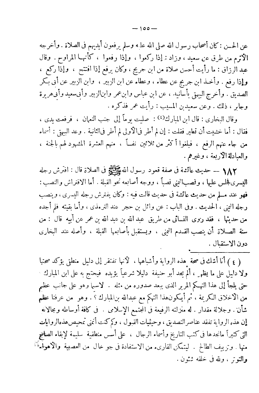 وَقَالَ البُخَارِيّ قَالَ ابْن الْمُبَارك صليت يَوْمًا إِلَى جنب النُّعْمَان فَرفعت يَدي فَقَالَ أما خشيت أَن تطير فَقلت إِن لم أطر فِي الأولَى لم أطر فِي الثَّانِيَة وعد الْبَيْهَقِيّ أَسمَاء من جَاءَ عَنْهُم الرّفْع فبلغوا أَكثر من ثَلَاثِينَ نفسا مِنْهُم الْعشْرَة الْمَشْهُود لَهُم بِالْجنَّةِ والعبادلة الْأَرْبَعَة وَغَيرهم
