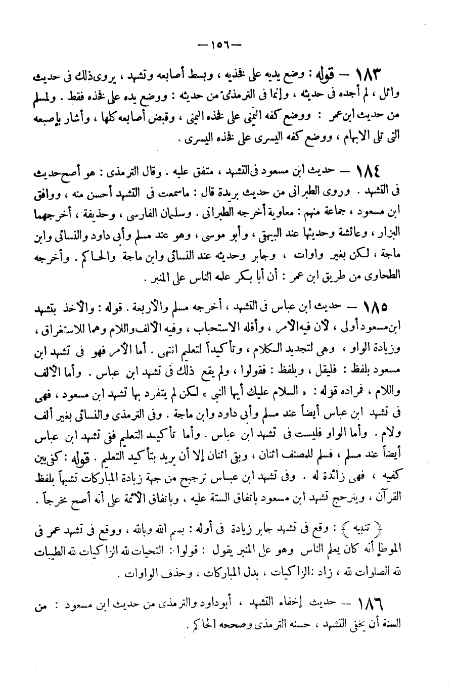 184 - حَدِيث ابْن مَسْعُود فِي التَّشَهُّد مُتَّفق عَلَيْهِ وَقَالَ التِّرْمِذِيّ هُوَ أصح حَدِيث فِي التَّشَهُّد وَرَوَى الطَّبَرَانِيّ من حَدِيث بُرَيْدَة قَالَ مَا سَمِعت فِي التَّشَهُّد أحسن مِنْهُ وَوَافَقَ ابْن مَسْعُود جمَاعَة مِنْهُم مُعَاوِيَة أخرجه الطَّبَرَانِيّ وسلمان الْفَارِسِي وَحُذَيْفَة أخرجهُمَا الْبَزَّار وَعَائِشَة وحديثها عِنْد الْبَيْهَقِيّ وَأَبُو مُوسَى وَهُوَ عِنْد مُسلم وَأبي دَاوُد وَالنَّسَائِيّ وَابْن ماجة لَكِن بِغَيْر واوات وَجَابِر وَحَدِيثه عِنْد النَّسَائِيّ وَابْن ماجة وَالْحَاكِم وَأخرجه الطَّحَاوِيّ من طَرِيق ابْن عمر أَن أَبَا بكر علمه النَّاس عَلَى الْمِنْبَر