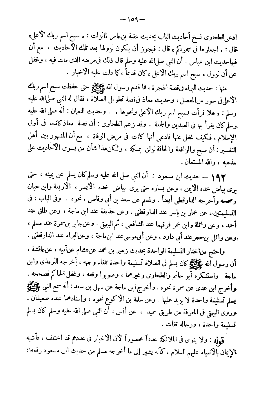 192 - حَدِيث ابْن مَسْعُود أَن النَّبِي صَلَّى اللَّهُ عَلَيْهِ وَسَلَّم َ كَانَ يسلم عَن يَمِينه حَتَّى يرَى بَيَاض خَدّه الْأَيْمن وَعَن يسَاره حَتَّى يرَى بَيَاض خَدّه الْأَيْسَر الْأَرْبَعَة وَابْن حبَان وَصَححهُ وَأخرجه الدَّارَقُطْنِيّ أَيْضا وَلمُسلم عَن سعد بن أبي وَقاص نَحوه وَفِي الْبَاب فِي التسليمتين عَن عمار بن يَاسر عِنْد الدَّارَقُطْنِيّ وَعَن حُذَيْفَة عِنْد ابْن ماجة وَعَن طلق عِنْد أَحْمد وَعَن وَاثِلَة وَابْن عمر فرقهما عِنْد الشَّافِعِي ثمَّ الْبَيْهَقِيّ وَعَن جَابر بن سَمُرَة عِنْد مُسلم وَعَن وَائِل بن حجر عِنْد أبي دَاوُد وَعَن أبي مُوسَى عِنْد ابْن ماجة وَعَن الْبَراء عِنْد الدَّارَقُطْنِيّ