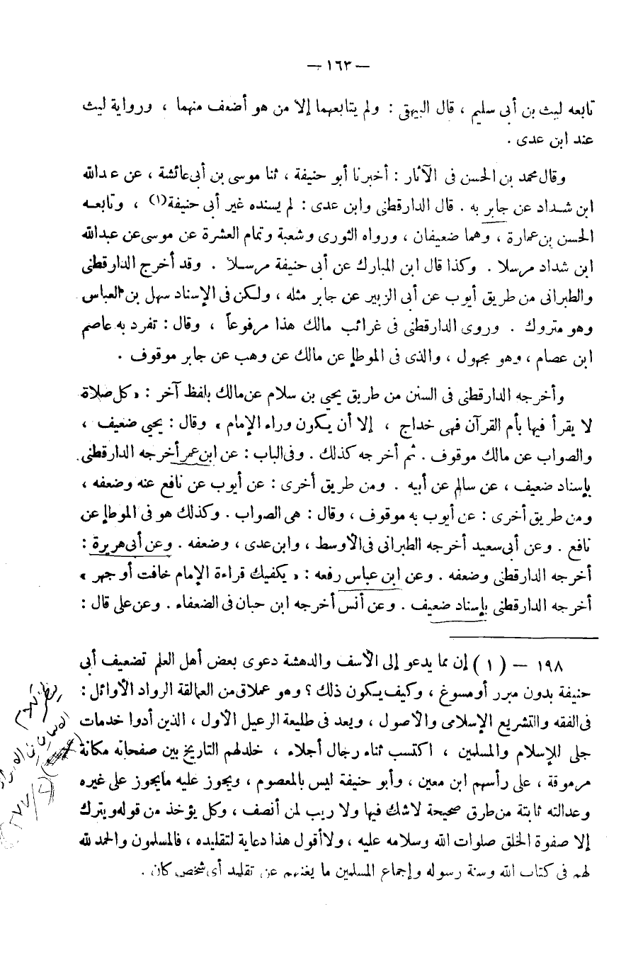 وَقَالَ مُحَمَّد بن الْحسن فِي الْآثَار أخبرنَا أَبُو حنيفَة ثَنَا مُوسَى بن أبي عَائِشَة عَن عبد الله ابْن شَدَّاد عَن جَابر بِهِ قَالَ الدَّارَقُطْنِيّ وَابْن عدي لم يسْندهُ غير أبي حنيفَة وَتَابعه الْحسن بن عمَارَة وهما ضعيفان وَرَوَاهُ الثَّوْريّ وَشعْبَة وَتَمام الْعشْرَة عَن مُوسَى عَن عبد الله ابْن شَدَّاد مُرْسلا وَكَذَا قَالَ ابْن الْمُبَارك عَن أبي حنيفَة مُرْسلا وَقد أخرج الدَّارَقُطْنِيّ وَالطَّبَرَانِيّ من طَرِيق أَيُّوب عَن أبي الزبير عَن جَابر مثله وَلَكِن فِي الْإِسْنَاد سهل بن الْعَبَّاس وَهُوَ مَتْرُوك وَرَوَى الدَّارَقُطْنِيّ فِي غرائب مَالك هَذَا مَرْفُوعا وَقَالَ تفرد بِهِ عَاصِم ابْن عِصَام وَهُوَ مَجْهُول وَالَّذِي فِي الْمُوَطَّإِ عَن مَالك عَن وهب عَن جَابر مَوْقُوف