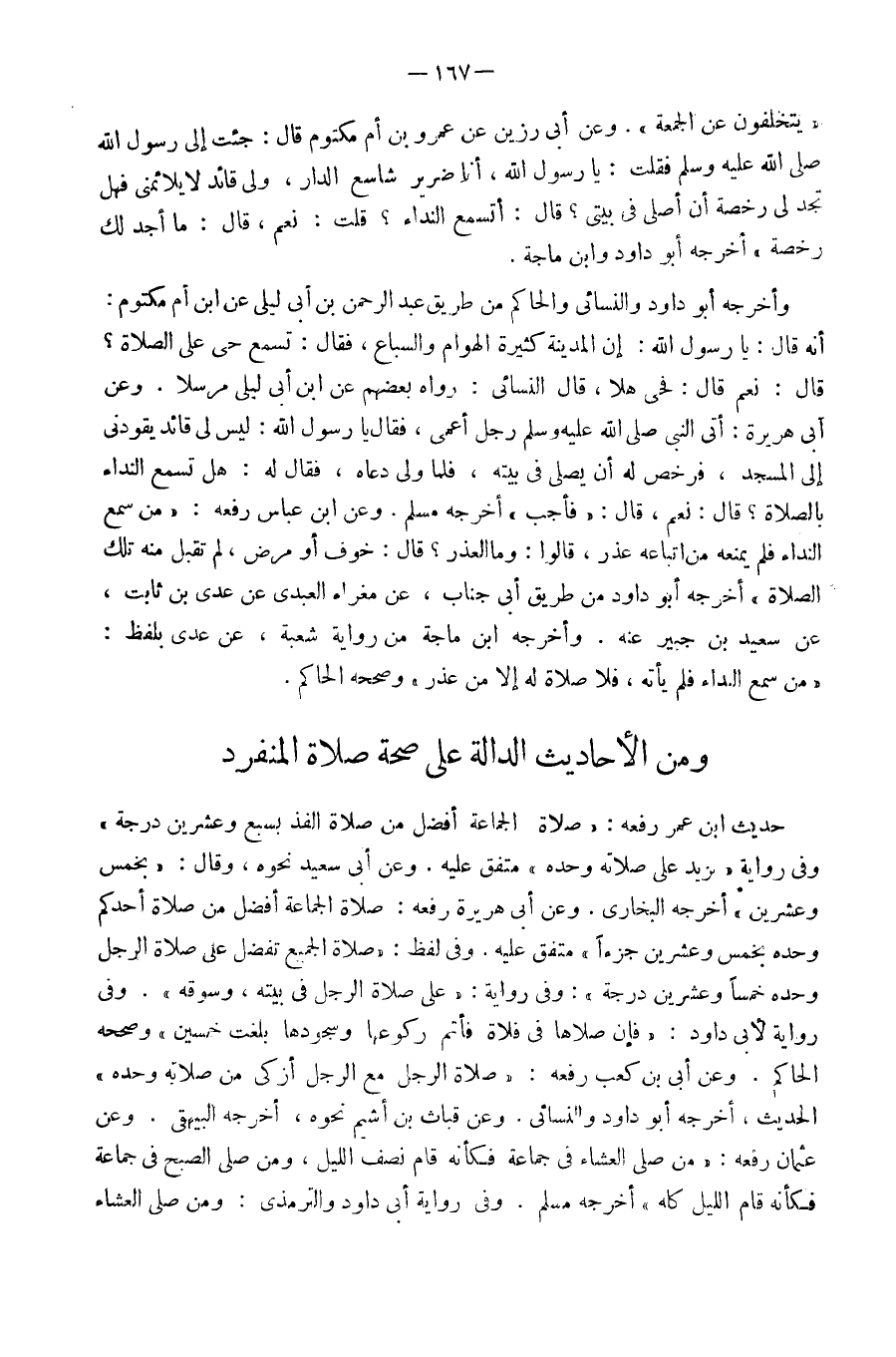 حَدِيث ابْن عمر رَفعه صَلَاة الْجَمَاعَة أفضل من صَلَاة الْفَذ بسع وَعشْرين دَرَجَة وَفِي رِوَايَة يزِيد عَلَى صلَاته وَحده مُتَّفق عَلَيْهِ وَعَن أبي سعيد نَحوه وَقَالَ بِخمْس وَعشْرين أخرجه البُخَارِيّ وَعَن أبي هُرَيْرَة رَفعه صَلَاة الْجَمَاعَة أفضل من صَلَاة أحدكُم وَحده بِخمْس وَعشْرين جُزْءا مُتَّفق عَلَيْهِ وَفِي لفظ صَلَاة الْجَمِيع تفضل عَلَى صَلَاة الرجل وَحده خمْسا وَعشْرين دَرَجَة وَفِي رِوَايَة عَلَى صَلَاة الرجل فِي بَيته وسوقه وَفِي رِوَايَة لأبي دَاوُد فَإِن صلاهَا فِي فلاة فَأَتمَّ ركوعها وسجودها بلغت خمسين وَصَححهُ الْحَاكِم عَن أبي كَعْب رَفعه صَلَاة الرجل مَعَ الرجل أَزْكَى من صلَاته وَحده الحَدِيث أخرجه أَبُو دَاوُد وَالنَّسَائِيّ وَعَن قباث بن أَشْيَم نَحوه أخرجه الْبَيْهَقِيّ وَعَن عُثْمَان رَفعه من صَلَّى الْعشَاء فِي جمَاعَة فَكَأَنَّهُ قَامَ نصف اللَّيْل وَمن صَلَّى الصُّبْح فِي جمَاعَة فَكَأَنَّهُ قَامَ اللَّيْل كُله أخرجه مُسلم وَفِي رِوَايَة أبي دَاوُد وَالتِّرْمِذِيّ وَمن صَلَّى الْعشَاء