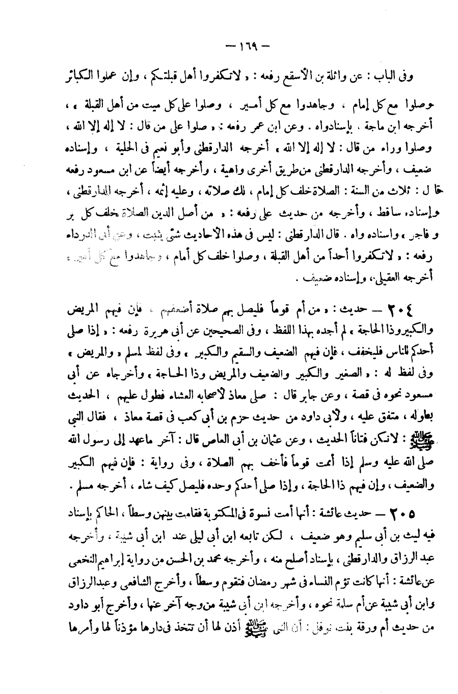 204 - حَدِيث من أم قوما فَليصل بهم صَلَاة أضعفهم فَإِن فيهم الْمَرِيض وَالْكَبِير وَذَا الْحَاجة لم أَجِدهُ بِهَذَا اللَّفْظ وَفِي الصَّحِيحَيْنِ عَن أبي هُرَيْرَة رَفعه إِذا صَلَّى أحدكُم للنَّاس فليخفف فَإِن فيهم الضَّعِيف والسقيم وَالْكَبِير وَفِي لفظ لمُسلم وَالْمَرِيض وَفِي لفظ لَهُ الصَّغِير وَالْكَبِير والضعيف وَالْمَرِيض وَذَا الْحَاجة وأخرجهما عَن أبي مَسْعُود نَحوه فِي قصَّة وَعَن جَابر قَالَ صَلَّى معَاذ لأَصْحَابه الْعشَاء فطول عَلَيْهِم الحَدِيث بِطُولِهِ مُتَّفق عَلَيْهِ وَلأبي دَاوُد من حَدِيث حزم بن أبي كَعْب فِي قصَّة معَاذ فَقَالَ النَّبِي صَلَّى اللَّهُ عَلَيْهِ وَسَلَّم َ لَا تكن فتانا الحَدِيث وَعَن عُثْمَان بن أبي الْعَاصِ قَالَ آخر مَا عهد إِلَى رَسُول الله صَلَّى اللَّهُ عَلَيْهِ وَسَلَّم َ إِذا أممت قوما فأخف بهم الصَّلَاة وَفِي رِوَايَة فَإِن فيهم الْكَبِير والضعيف وَإِن فيهم ذَا الْحَاجة وَإِذا صَلَّى أحدكُم وَحده فَليصل كَيفَ شَاءَ أخرجه مُسلم