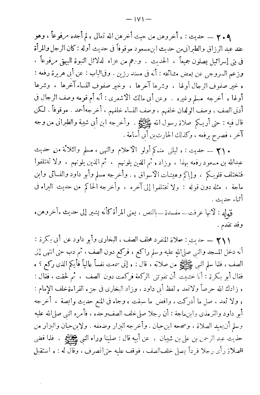 209 - حَدِيث أخروهن من حَيْثُ أخرهن الله تَعَالَى لم أَجِدهُ مَرْفُوعا وَهُوَ عِنْد عبد الرَّزَّاق وَالطَّبَرَانِيّ من حَدِيث ابْن مَسْعُود مرقوفا فِي حَدِيث أَوله كَانَ الرجل وَالْمَرْأَة فِي بني إِسْرَائِيل يصلونَ جَمِيعًا الحَدِيث وَوهم من عزاهُ لدلائل النُّبُوَّة للبيهقي مَرْفُوعا وَزعم السرُوجِي عَن بعض مشائخه أَنه فِي مُسْند رزين وَفِي الْبَاب عَن أبي هُرَيْرَة رَفعه خير صُفُوف الرِّجَال أَولهَا وشرها آخرهَا وَخير صُفُوف النِّسَاء آخرهَا وشرها أَولهَا أخرجه مُسلم وَغَيره وَعَن أبي مَالك الْأَشْعَرِيّ أَنه أم قومه وصف الرِّجَال فِي أدنَى الصَّفّ وصف الْولدَان خَلفهم وصف النِّسَاء خَلفهم أخرجه أَحْمد مَوْقُوفا لَكِن قَالَ فِيهِ حَتَّى أريكم صَلَاة رَسُول الله صَلَّى اللَّهُ عَلَيْهِ وَسَلَّم َ وَأخرجه ابْن أبي شيبَة وَالطَّبَرَانِيّ من وَجه آخر فَصرحَ بِرَفْعِهِ وَكَذَلِكَ الْحَارِث بن أبي أُسَامَة