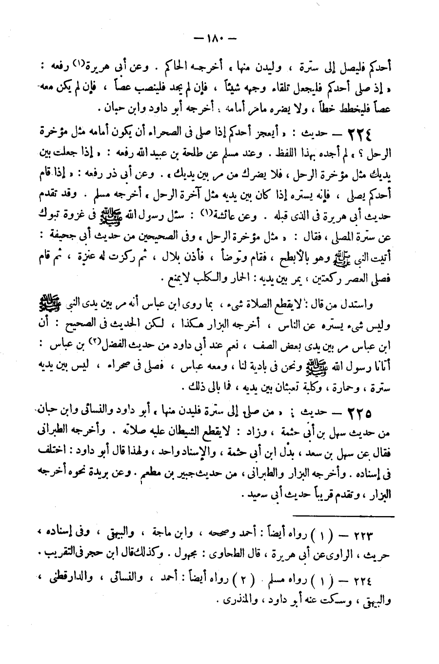 224 - حَدِيث أَيعْجزُ أحدكُم إِذا صَلَّى فِي الصَّحرَاء أَن يكون أَمَامه مثل مؤخرة الرحل لم أَجِدهُ بِهَذَا اللَّفْظ وَعند مُسلم عَن طَلْحَة بن عبيد الله رَفعه إِذا جعلت بَين يَديك مثل مؤخرة الرحل فَلَا يَضرك من مر بَين يَديك وَعَن أبي ذَر رَفعه إِذا قَامَ أحدكُم يُصَلِّي فَإِنَّهُ يستره إِذا كَانَ بَين يَدَيْهِ مثل آخِرَة الرحل أخرجه مُسلم وَقد تقدم حَدِيث أبي هُرَيْرَة فِي الَّذِي قبله وَعَن عَائِشَة سُئِلَ رَسُول الله صَلَّى اللَّهُ عَلَيْهِ وَسَلَّم َ فِي غَزْوَة تَبُوك عَن ستْرَة الْمُصَلِّي فَقَالَ مثل مؤخرة الرحل وَفِي الصَّحِيحَيْنِ من حَدِيث أبي جُحَيْفَة أتيت النَّبِي صَلَّى اللَّهُ عَلَيْهِ وَسَلَّم َ هُوَ بِالْأَبْطح فَقَامَ وَتَوَضَّأ فَأذن بِلَال ثمَّ ركزت لَهُ عنزة ثمَّ قَامَ فَصَلى الْعَصْر رَكْعَتَيْنِ يمر بَين يَدَيْهِ الْحمار وَالْكَلب لَا يمْنَع