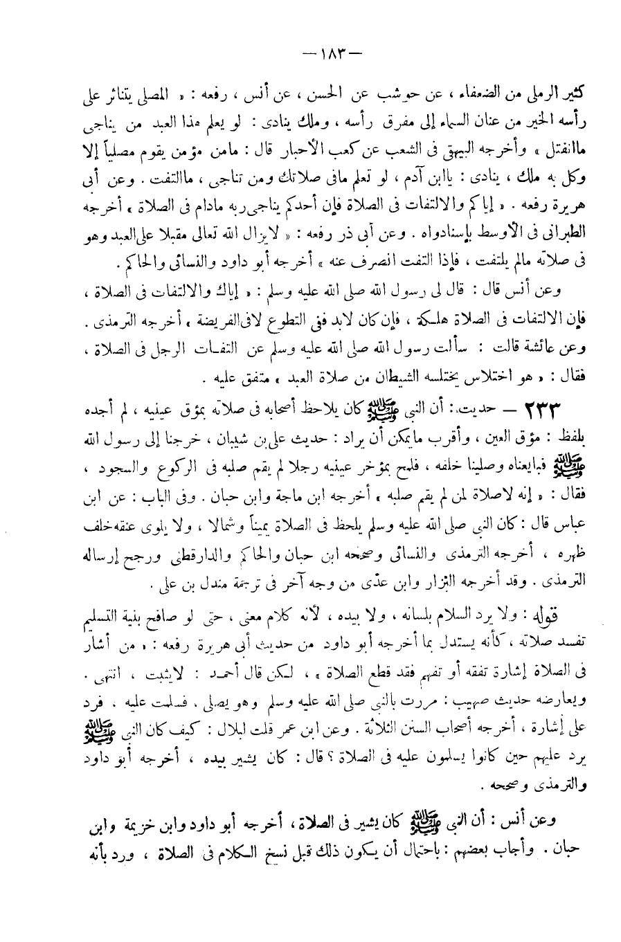 233 - حَدِيث أَن النَّبِي صَلَّى اللَّهُ عَلَيْهِ وَسَلَّم َ كَانَ يُلَاحظ أَصْحَابه فِي صلَاته بمؤق عَيْنَيْهِ لم أَجِدهُ بِلَفْظ مؤق الْعين وَأقرب مَا يُمكن أَن يُرَاد حَدِيث عَلّي بن شَيبَان خرجنَا إِلَى رَسُول الله صَلَّى اللَّهُ عَلَيْهِ وَسَلَّم َ فَبَايَعْنَاهُ وصلينا خَلفه فلمح بمؤخر عَيْنَيْهِ رجلا لم يقم صلبه فِي الرُّكُوع وَالسُّجُود فَقَالَ إِنَّه لَا صَلَاة لمن لم يقم صلبه أخرجه ابْن ماجة وَابْن حبَان وَفِي الْبَاب عَن ابْن عَبَّاس قَالَ كَانَ النَّبِي صَلَّى اللَّهُ عَلَيْهِ وَسَلَّم َ يلحظ فِي الصَّلَاة يَمِينا وَشمَالًا وَلَا يلوي عُنُقه خلف ظَهره أخرجه التِّرْمِذِيّ وَالنَّسَائِيّ وَصَححهُ ابْن حبَان وَالْحَاكِم وَالدَّارَقُطْنِيّ وَرجح إرْسَاله التِّرْمِذِيّ وَقد أخرجه الْبَزَّار وَابْن عدي من وَجه آخر فِي تَرْجَمَة منْدَل بن عَلّي