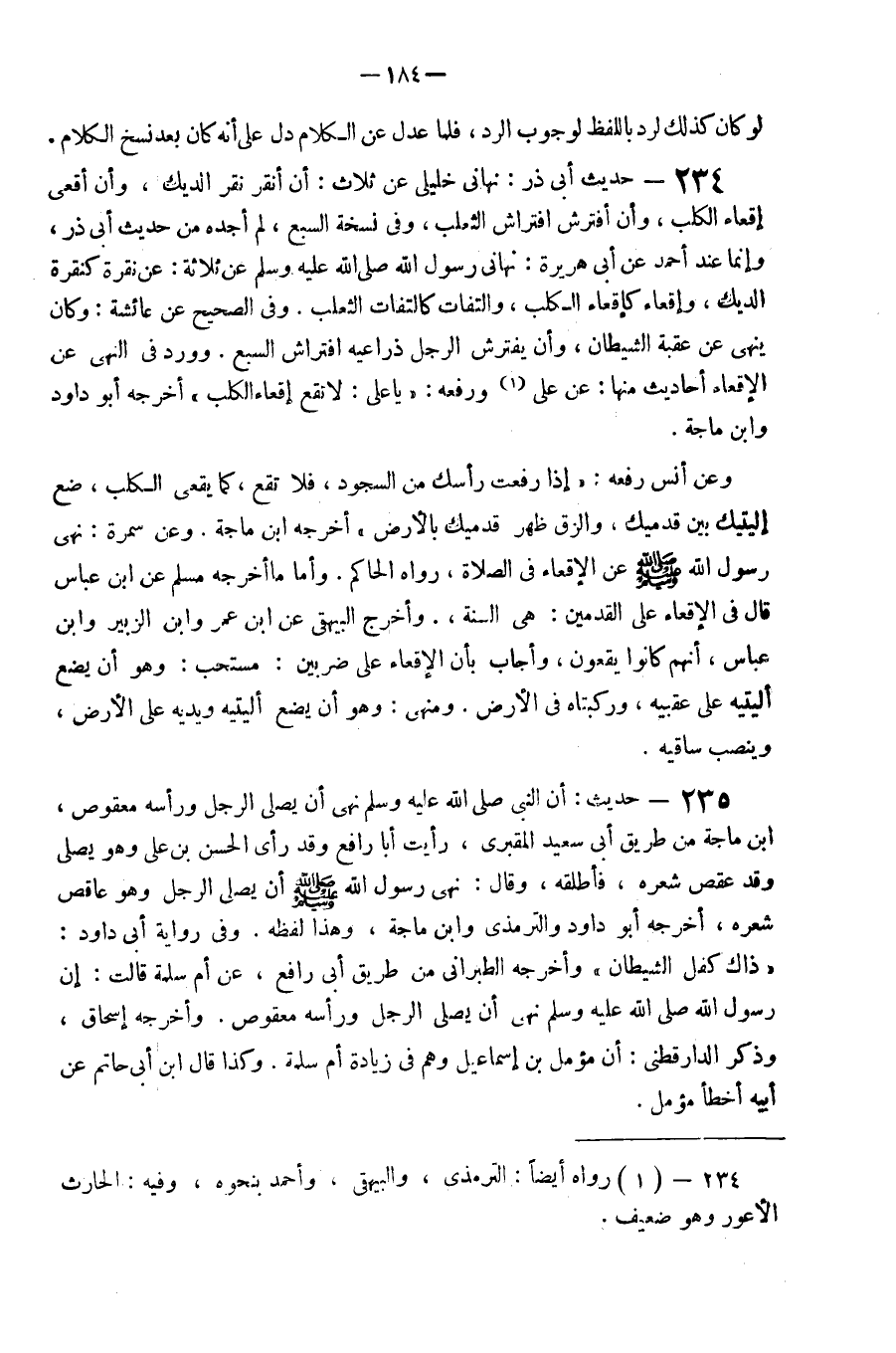 234 - حَدِيث أبي ذَر نهاني خليلي عَن ثَلَاث أَن أنقر نقر الديك وَأَن أقعي إقعاء الْكَلْب وَأَن أفترش إفتراش الثَّعْلَب وَفِي نُسْخَة السَّبع لم أَجِدهُ من حَدِيث أبي ذَر وَإِنَّمَا عِنْد أَحْمد عَن أبي هُرَيْرَة نهاني رَسُول الله صَلَّى اللَّهُ عَلَيْهِ وَسَلَّم َ عَن ثَلَاثَة عَن نقرة كنقرة الديك وإقعاء وكإقعاء الْكَلْب كالتفات الثَّعْلَب وَفِي الصَّحِيح عَن عَائِشَة وَكَانَ ينْهَى عَن عقبَة الشَّيْطَان وَأَن يفترش الرجل ذِرَاعَيْهِ افتراش السَّبع وَورد فِي النَّهْي عَن الإقعاء أَحَادِيث مِنْهَا عَن عَلّي وَرَفعه يَا عَلّي لَا تقع إقعاء الْكَلْب أخرجه أَبُو دَاوُد وَابْن ماجة