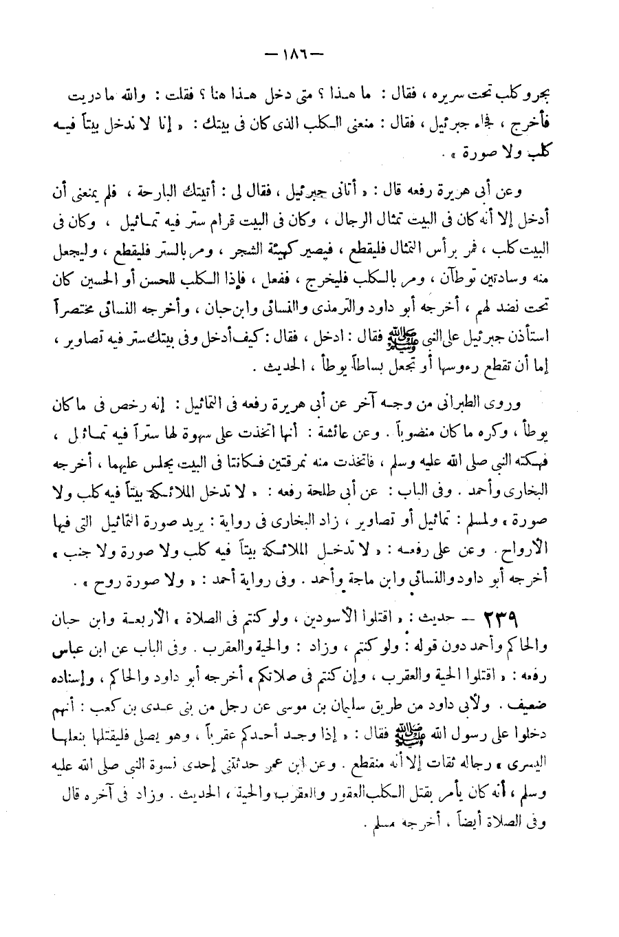 239 - حَدِيث اقْتُلُوا الأسودين وَلَو كُنْتُم فِي الصَّلَاة الْأَرْبَعَة وَابْن حبَان وَالْحَاكِم وَأحمد دون قَوْله وَلَو كُنْتُم وَزَاد والحية وَالْعَقْرَب وَفِي الْبَاب عَن ابْن عَبَّاس رَفعه اقْتُلُوا الْحَيَّة وَالْعَقْرَب وَإِن كُنْتُم فِي صَلَاتكُمْ أخرجه أَبُو دَاوُد وَالْحَاكِم وَإِسْنَاده ضَعِيف وَلأبي دَاوُد من طَرِيق سُلَيْمَان بن مُوسَى عَن رجل من بني عدي بن كَعْب أَنهم دخلُوا عَلَى رَسُول الله صَلَّى اللَّهُ عَلَيْهِ وَسَلَّم َ فَقَالَ إِذا وجد أحدكُم عقربا وَهُوَ يُصَلِّي فليقتلها بنعلها الْيُسْرَى رِجَاله ثِقَات إِلَّا أَنه مُنْقَطع وَعَن ابْن عمر حَدَّثتنِي إِحْدَى نسْوَة النَّبِي صَلَّى اللَّهُ عَلَيْهِ وَسَلَّم َ أَنه كَانَ يَأْمر بقتل الْكَلْب الْعَقُور وَالْعَقْرَب والحية الحَدِيث وَزَاد فِي آخِره قَالَ وَفِي الصَّلَاة أَيْضا أخرجه مُسلم