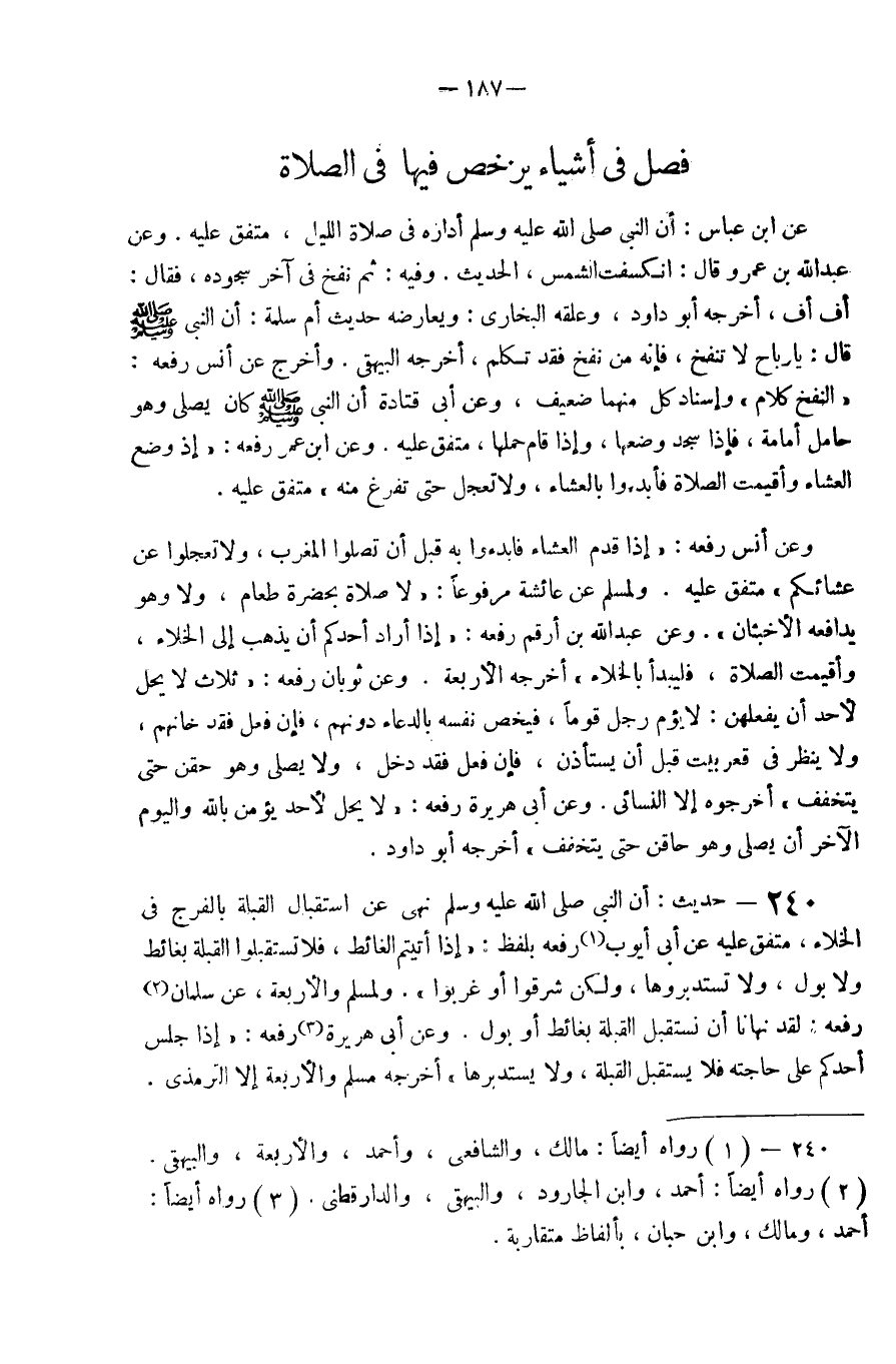 عَن ابْن عَبَّاس أَن النَّبِي صَلَّى اللَّهُ عَلَيْهِ وَسَلَّم َ أداره فِي صَلَاة اللَّيْل مُتَّفق عَلَيْهِ وَعَن عبد الله بن عَمْرو قَالَ انكسفت الشَّمْس الحَدِيث وَفِيه ثمَّ نفخ فِي آخِره سُجُوده فَقَالَ أُفٍّ أُفٍّ أخرجه أَبُو دَاوُد وعلقه البُخَارِيّ ويعارضه حَدِيث أم سَلمَة أَن النَّبِي صَلَّى اللَّهُ عَلَيْهِ وَسَلَّم َ قَالَ يَا رَبَاح لَا تنفخ فَإِنَّهُ من نفخ فقد تكلم أخرجه الْبَيْهَقِيّ وَأخرج عَن أنس رَفعه النفخ كَلَام وَإسْنَاد كل مِنْهُمَا ضَعِيف وَعَن أبي قَتَادَة أَن النَّبِي صَلَّى اللَّهُ عَلَيْهِ وَسَلَّم َ كَانَ يُصَلِّي وَهُوَ حَامِل أُمَامَة فَإِذا سجد وَضعهَا وَإِذا قَامَ حملهَا مُتَّفق عَلَيْهِ وَعَن ابْن عمر رَفعه إِذا وضع الْعشَاء وأقيمت الصَّلَاة فأبدءوا بالعشاء وَلَا تعجل حَتَّى تفرغ مِنْهُ مُتَّفق عَلَيْهِ