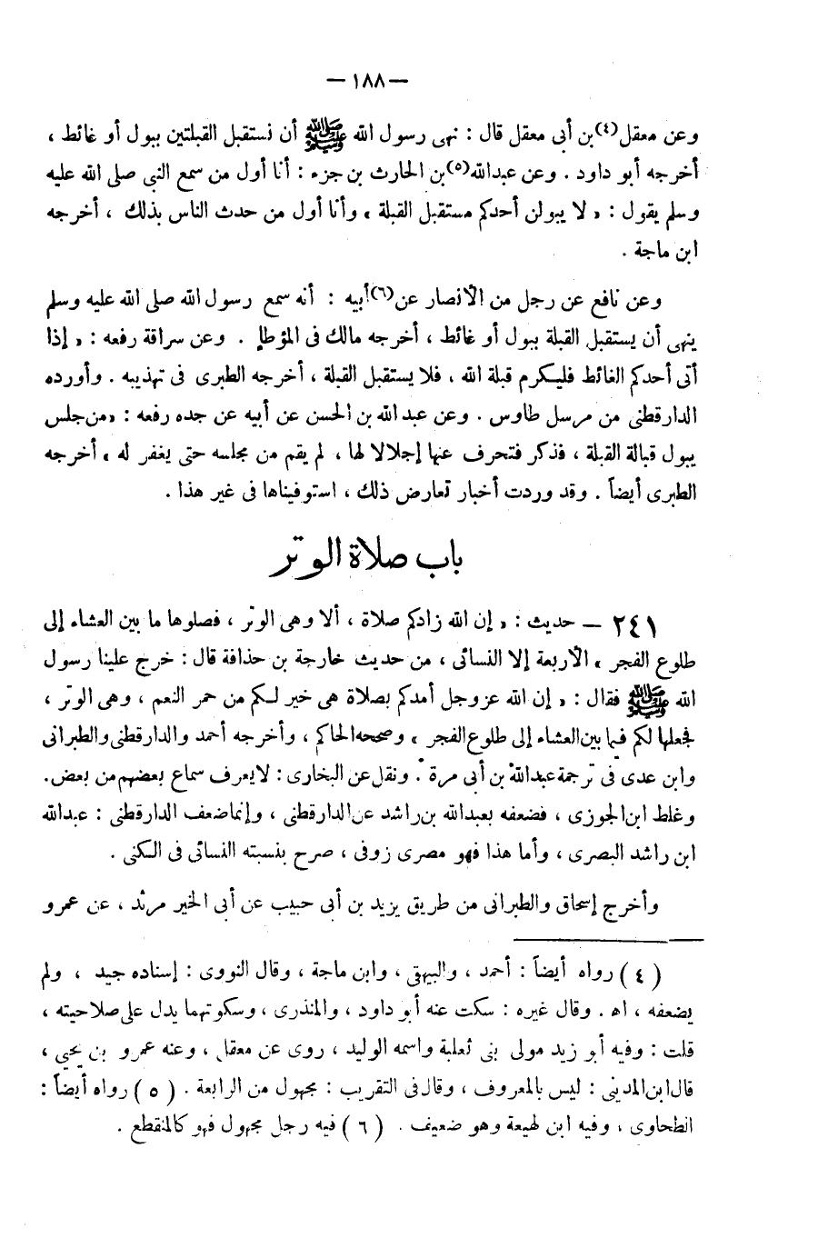 214 - حَدِيث إِن الله زادكم صَلَاة أَلا وَهِي الْوتر فصلوها مَا بَين الْعشَاء إِلَى طُلُوع الْفجْر الْأَرْبَعَة إِلَّا النَّسَائِيّ من حَدِيث خَارِجَة بن حذافة قَالَ خرج علينا رَسُول الله صَلَّى اللَّهُ عَلَيْهِ وَسَلَّم َ فَقَالَ إِن الله عَزَّ وَجَلَّ أمدكم بِصَلَاة هِيَ خير لكم من حمر النعم وَهِي الْوتر فَجَعلهَا لكم فِيمَا بَين الْعشَاء إِلَى طُلُوع الْفجْر وَصَححهُ الْحَاكِم وَأخرجه أَحْمد وَالدَّارَقُطْنِيّ وَالطَّبَرَانِيّ وَابْن عدي فِي تَرْجَمَة عبد الله بن أبي مرّة وَنقل عَن البُخَارِيّ لَا يعرف سَماع بَعضهم من بعض وَغلط ابْن الْجَوْزِيّ فضعفه بِعَبْد الله بن رَاشد عَن الدَّارَقُطْنِيّ وَإِنَّمَا ضعف الدَّارَقُطْنِيّ عبد الله ابْن رَاشد الْبَصْرِيّ وَأما هَذَا فَهُوَ مصري زوفى صرح بنسبته النَّسَائِيّ فِي الكنى