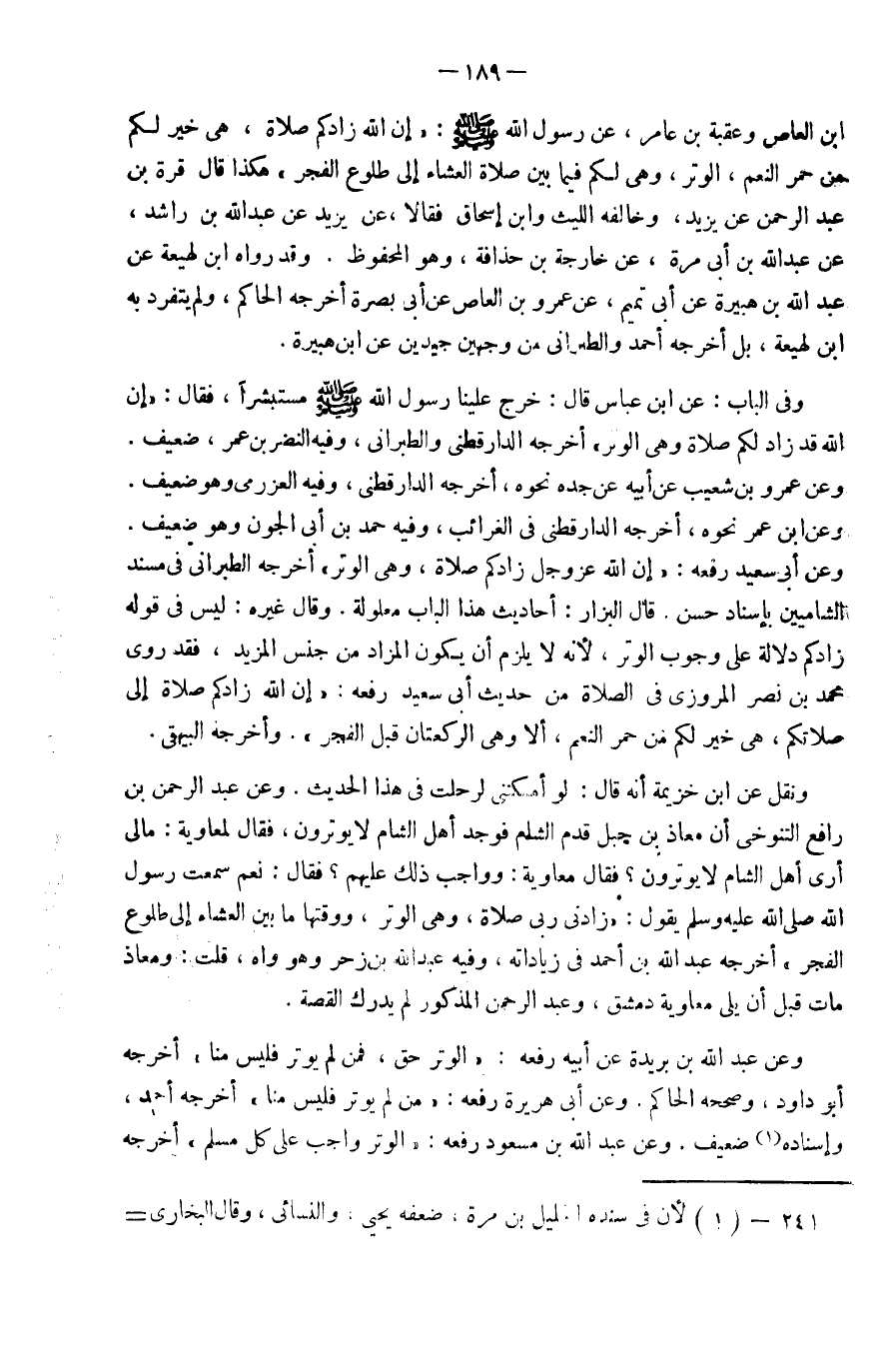 ابْن الْعَاصِ وَعقبَة بن عَامر عَن رَسُول الله صَلَّى اللَّهُ عَلَيْهِ وَسَلَّم َ إِن الله زادكم صَلَاة هِيَ خير لكم من حمر النعم الْوتر وَهِي لكم فِيمَا بَين صَلَاة الْعشَاء إِلَى طُلُوع الْفجْر هَكَذَا قَالَ قُرَّة بن عبد الرَّحْمَن عَن يزِيد وخافه اللَّيْث وَابْن إِسْحَاق فَقَالَا عَن يزِيد عَن عبد الله بن رَاشد عَن عبد الله بن أبي مرّة عَن خَارِجَة بن حذافة وَهُوَ الْمَحْفُوظ وَقد رَوَاهُ ابْن لَهِيعَة عَن عبد الله بن هُبَيْرَة عَن أبي تَمِيم عَن عَمْرو بن الْعَاصِ عَن أبي بصرة أخرجه الْحَاكِم وَلم يتفرد بِهِ ابْن لَهِيعَة بل أخرجه أَحْمد وَالطَّبَرَانِيّ من وَجْهَيْن جَيِّدين عَن ابْن هُبَيْرَة