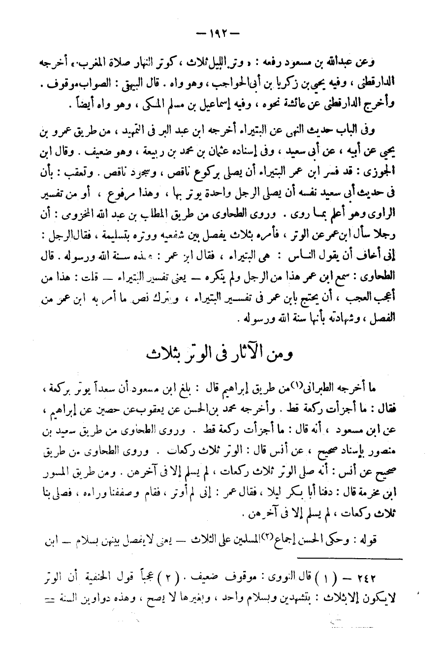 مَا أخرجه الطَّبَرَانِيّ من طَرِيق إِبْرَاهِيم قَالَ ابْن مَسْعُود أَن سَعْدا يُوتر بِرَكْعَة فَقَالَ مَا أَجْزَأت رَكْعَة قطّ وَأخرجه مُحَمَّد بن يَعْقُوب عَن حُصَيْن عَن إِبْرَاهِيم عَن ابْن مَسْعُود أَنه قَالَ مَا أَجْزَأت رَكْعَة قطّ وَرَوَى الطَّحَاوِيّ من طَرِيق سعد بن مَنْصُور بِإِسْنَاد صَحِيح عَن أنس قَالَ الْوتر ثَلَاث رَكْعَات وَرَوَى الطَّحَاوِيّ من طَرِيق صَحِيح عَن أنس أَنه صَلَّى الْوتر ثَلَاث رَكْعَات لم يسلم إِلَّا فِي آخِرهنَّ وَمن طَرِيق الْمسور ابْن مخرمَة قَالَ دفنا أَبَا بكر لَيْلًا فَقَالَ عمر إِنِّي لم أوتر فَقَامَ وصففنا وَرَاءه فَصَلى بِنَا ثَلَاث رَكْعَات لم يسلم إِلَّا فِي آخِرهنَّ
