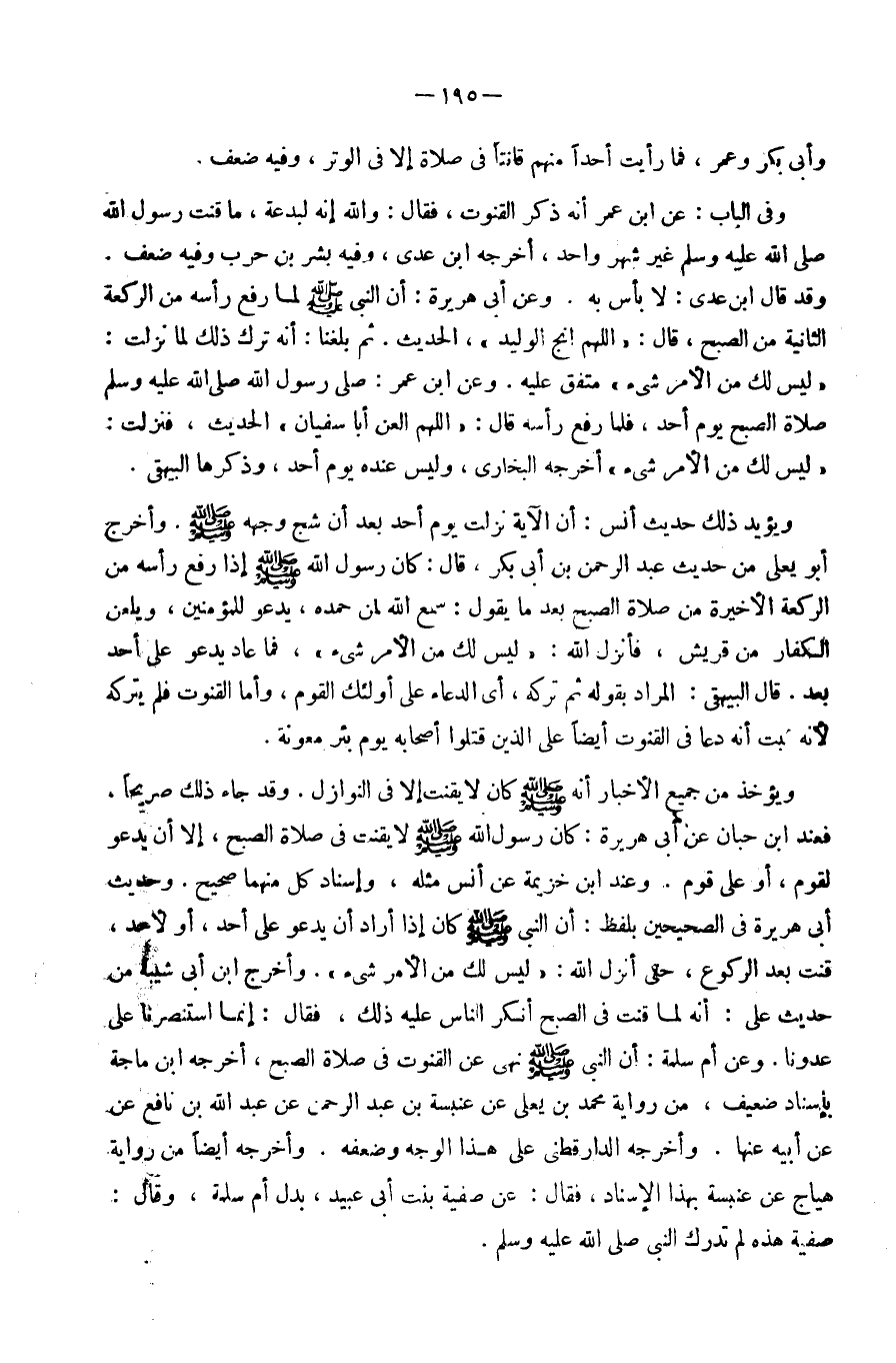 وَيُؤْخَذ من جَمِيع الْأَخْبَار أَنه صَلَّى اللَّهُ عَلَيْهِ وَسَلَّم َ كَانَ لَا يقنت فِي النَّوَازِل وَقد جَاءَ ذَلِك صَرِيحًا فَعِنْدَ ابْن حبَان عَن أبي هُرَيْرَة كَانَ رَسُول الله صَلَّى اللَّهُ عَلَيْهِ وَسَلَّم َ لَا يقنت فِي صَلَاة الصُّبْح إِلَّا أَن يَدْعُو لقوم أَو عَلَى قوم وَعند ابْن خُزَيْمَة عَن أنس مثله وَإسْنَاد كل مِنْهُمَا صَحِيح وَحَدِيث أبي هُرَيْرَة فِي الصَّحِيحَيْنِ بِلَفْظ أَن النَّبِي صَلَّى اللَّهُ عَلَيْهِ وَسَلَّم َ كَانَ إِذا أَرَادَ أَن يَدْعُو عَلَى أحد أَو لأحد قنت بعد الرُّكُوع حَتَّى أنزل الله {لَيْسَ لَك من الْأَمر شَيْء} وَأخرج ابْن أبي شيبَة من حَدِيث عَلّي أَنه لما قنت فِي الصُّبْح أنكر النَّاس عَلَيْهِ ذَلِك فَقَالَ إِنَّمَا استنصرنا عَلَى عدونا وَعَن أم سَلمَة أَن النَّبِي صَلَّى اللَّهُ عَلَيْهِ وَسَلَّم َ نهَى عَن الْقُنُوت فِي صَلَاة الصُّبْح أخرجه ابْن ماجة بِإِسْنَاد ضَعِيف من رِوَايَة مُحَمَّد بن يعْلى عَن عَنْبَسَة بن عبد الرَّحْمَن عَن عبد الله بن نَافِع عَن أَبِيه عَنْهَا وَأخرجه الدَّارَقُطْنِيّ عَلَى هَذَا الْوَجْه وَضَعفه وَأخرجه أَيْضا من رِوَايَة هياج عَن عَنْبَسَة بِهَذَا الْإِسْنَاد فَقَالَ عَن صَفِيَّة بنت أبي عبيد بدل أم سَلمَة وَقَالَ صَفِيَّة هَذِه لم تدْرك النَّبِي صَلَّى اللَّهُ عَلَيْهِ وَسَلَّم َ