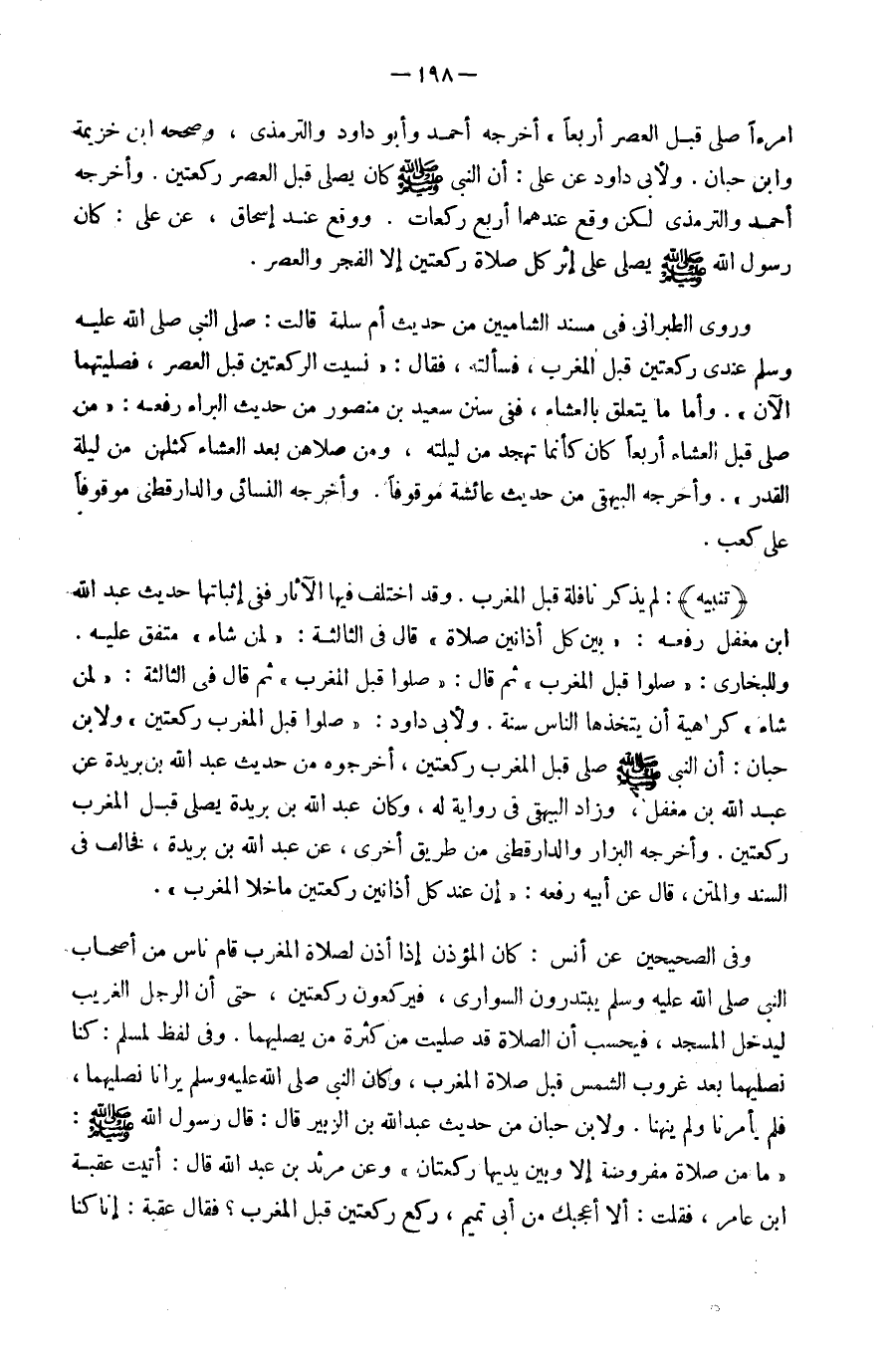 وَفِي الصَّحِيحَيْنِ عَن أنس كَانَ الْمُؤَذّن إِذا أذن لصَلَاة الْمغرب قَامَ نَاس من أَصْحَاب النَّبِي صَلَّى اللَّهُ عَلَيْهِ وَسَلَّم َ يبتدرون السوارى فيركعون رَكْعَتَيْنِ حَتَّى أَن الرجل الْغَرِيب ليدْخل الْمَسْجِد فيحسب أَن الصَّلَاة قد صليت من كَثْرَة من يُصَلِّيهمَا وَفِي لفظ لمُسلم كُنَّا نصليهما بعد غرُوب الشَّمْس قبل صَلَاة الْمغرب وَكَانَ النَّبِي صَلَّى اللَّهُ عَلَيْهِ وَسَلَّم َ يَرَانَا نصليهما فَلم يَأْمُرنَا وَلم ينهنا وَلابْن حبَان من حَدِيث عبد الله بن الزبير قَالَ قَالَ رَسُول الله صَلَّى اللَّهُ عَلَيْهِ وَسَلَّم َ مَا من صَلَاة مَفْرُوضَة إِلَّا وَبَين يَديهَا رَكْعَتَانِ وَعَن مرْثَد بن عبد الله قَالَ أتيت عقبَة ابْن عَامر فَقلت أَلا أعْجبك من أبي تَمِيم ركع رَكْعَتَيْنِ قبل الْمغرب فَقَالَ عقبَة إِنَّا كُنَّا