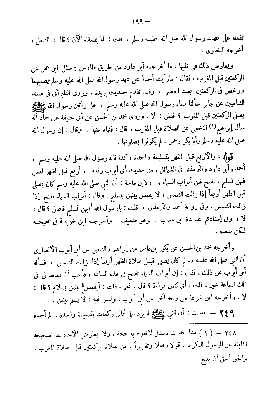 ويعارض ذَلِك فِي نَفيهَا مَا أخرجه أَبُو دَاوُد من طَرِيق طَاوس سُئِلَ ابْن عمر عَن الرَّكْعَتَيْنِ قبل الْمغرب فَقَالَ مَا رَأَيْت أحدا عَلَى عهد رَسُول الله صَلَّى اللَّهُ عَلَيْهِ وَسَلَّم َ يُصَلِّيهمَا وَرخّص فِي الرَّكْعَتَيْنِ بعد الْعَصْر وَقد تقدم حَدِيث بُرَيْدَة وَرَوَى الطَّبَرَانِيّ فِي مُسْند الشاميين عَن جَابر سَأَلنَا نسَاء رَسُول الله صَلَّى اللَّهُ عَلَيْهِ وَسَلَّم َ هَل رأيتن رَسُول الله صَلَّى اللَّهُ عَلَيْهِ وَسَلَّم َ يُصَلِّي رَكْعَتَيْنِ قبل الْمغرب فَقُلْنَ لَا وَرُوِيَ مُحَمَّد بن الْحسن عَن أبي حنيفَة عَن حَمَّاد أَنه سَأَلَ إِبْرَاهِيم النَّخعِيّ عَن الصَّلَاة قبل الْمغرب قَالَ فَنَهَاهُ عَنْهَا وَقَالَ إِن رَسُول الله صَلَّى اللَّهُ عَلَيْهِ وَسَلَّم َ وَأَبا بكر وَعمر لم يَكُونُوا يصلونها