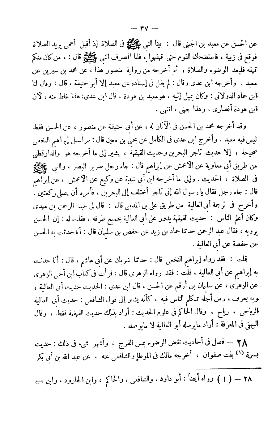 28 - فصل فِي أَحَادِيث نقض الْوضُوء بِمَسّ الْفرج وَأشهر شي فِي ذَلِك حَدِيث بسرة بنت صَفْوَان أخرجه مَالك فِي الْمُوَطَّإِ وَالشَّافِعِيّ عَنهُ عَن عبد الله بن أبي بكر