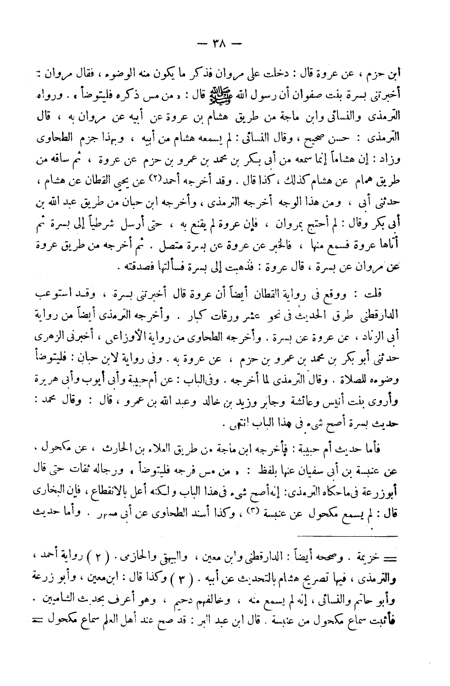 ابْن حزم عَن عُرْوَة قَالَ دخلت عَلَى مَرْوَان فَذكر مَا يكون مِنْهُ الْوضُوء فَقَالَ مَرْوَان اخبرتني بسرة بنت صَفْوَان أَن رَسُول الله صَلَّى اللَّهُ عَلَيْهِ وَسَلَّم َ قَالَ من مس ذكره فَليَتَوَضَّأ وَرَوَاهُ التِّرْمِذِيّ وَالنَّسَائِيّ وَابْن ماجة من طَرِيق هِشَام بن عُرْوَة عَن أَبِيه عَن مَرْوَان بِهِ قَالَ التِّرْمِذِيّ حسن صَحِيح وَقَالَ النَّسَائِيّ لم يسمعهُ هِشَام من أَبِيه وَبِهَذَا جزم الطَّحَاوِيّ وَزَاد إِن هشاما إِنَّمَا سَمعه من أبي بكر بن مُحَمَّد بن عَمْرو بن حزم عَن عُرْوَة ثمَّ سَاقه من طَرِيق همام عَن هِشَام كَذَلِك كَذَا قَالَ وَقد أخرجه أَحْمد عَن يحي الْقطَّان عَن هِشَام حَدثنِي أبي وَمن هَذَا الْوَجْه أخرجه التِّرْمِذِيّ وَأخرجه ابْن حبَان من طَرِيق عبد الله بن أبي بكر وَقَالَ لم أحتج بِمَرْوَان فَإِن عُرْوَة لم يقنع بِهِ حَتَّى أرسل شرطيا إِلَى بسرة ثمَّ أَتَاهَا عُرْوَة فَسمع مِنْهَا فَالْخَبَر عَن عُرْوَة عَن بسرة مُتَّصِل ثمَّ أخرجه من طَرِيق عُرْوَة عَن مَرْوَان عَن بسرة قَالَ فَذَهَبت إِلَى بسرة فسألتها فصدقته