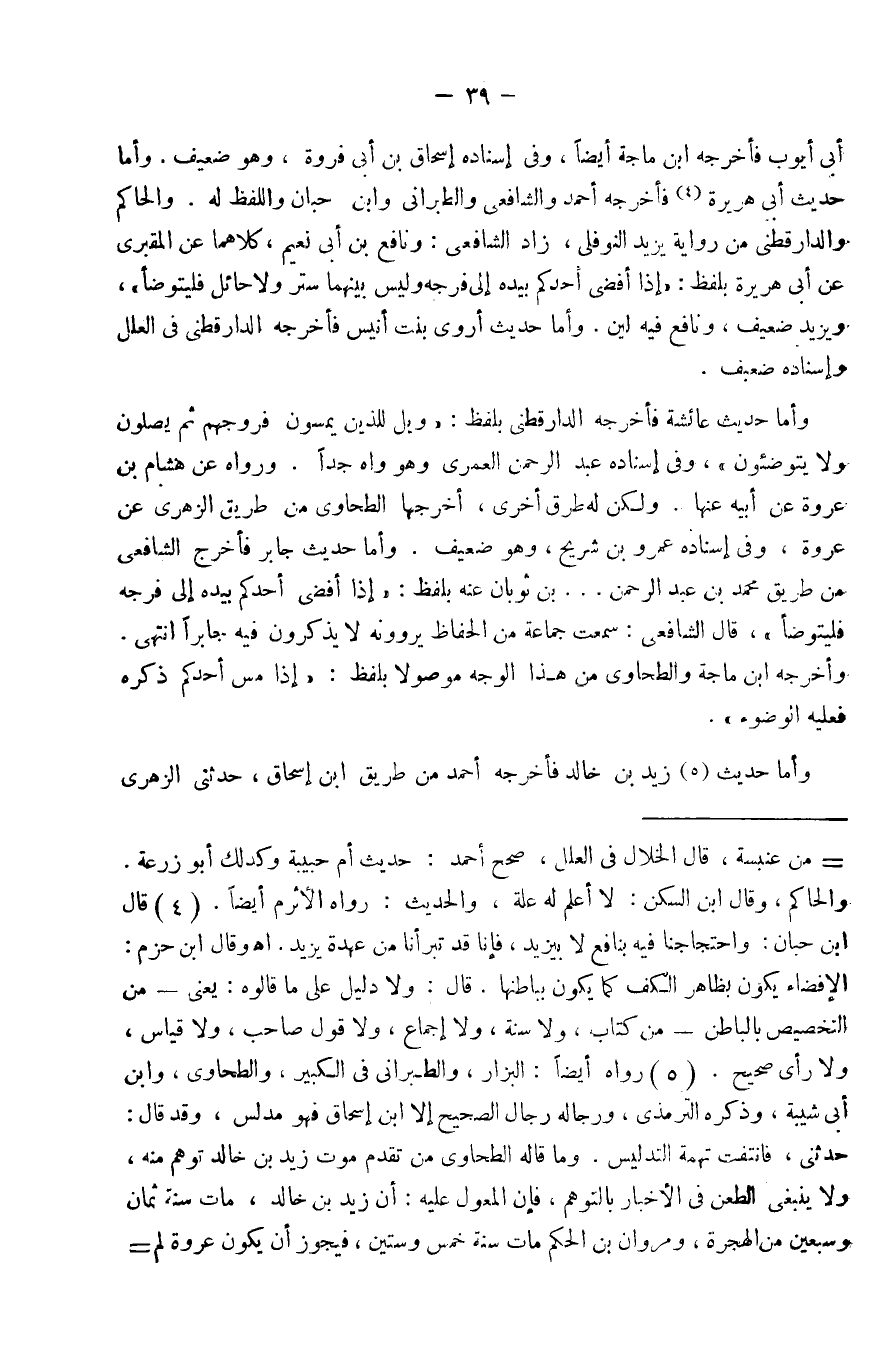 أبي أَيُّوب فَأخْرجهُ ابْن ماجة أَيْضا وَفِي إِسْنَاده إِسْحَاق بن أبي فَرْوَة وَهُوَ ضَعِيف وَأما حَدِيث أبي هُرَيْرَة فَأخْرجهُ أَحْمد وَالشَّافِعِيّ وَالطَّبَرَانِيّ وَابْن حبَان وَاللَّفْظ لَهُ وَالْحَاكِم وَالدَّارَقُطْنِيّ من رِوَايَة يزِيد النَّوْفَلِي زَاد الشَّافِعِي وَنَافِع بن أبي نعيم كِلَاهُمَا عَن المَقْبُري عَن ابي هُرَيْرَة بِلَفْظ إِذا أَفْضَى أحدكُم بِيَدِهِ إِلَى فرجه وَلَيْسَ بَينهمَا ستر وَلَا حَائِل فَليَتَوَضَّأ وَيزِيد ضَعِيف وَنَافِع فِيهِ لين وَأما حَدِيث أروى بنت أنيس فَأخْرجهُ الدَّارقطني فِي الْعِلَل وَإِسْنَاده ضَعِيف