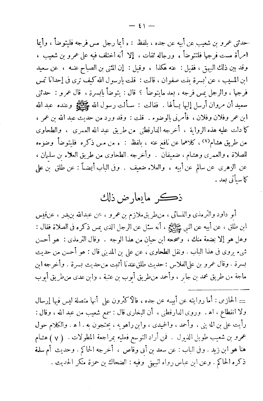 حَدثنِي عَمْرو بن شُعَيْب عَن أَبِيه عَن جده بِلَفْظ أَيّمَا رجل مس فرجه فَليَتَوَضَّأ وَأَيّمَا إمرة مست فرجهَا فلتتوضأ وَرِجَاله ثِقَات إِلَّا أَنه اخْتلف فِيهِ عَلَى عَمْرو بن شُعَيْب وَقد بَين ذَلِك الْبَيْهَقِيّ فَقيل عَنهُ هَكَذَا وَقيل إِن المثني بن الصَّباح عَنهُ عَن سعيد ابْن الْمسيب عَن بسرة بنت صَفْوَان قَالَت يَا رَسُول الله كَيفَ ترَى فِي إحدانا تمس فرجهَا وَالرجل يمس فرجه بعد مَا يتَوَضَّأ قَالَ يتَوَضَّأ يَا بسرة قَالَ عَمْرو حَدثنِي سعيد أَن مَرْوَان أرسل إِلَيْهَا يسْأَلهَا فَقَالَت سَأَلت رَسُول الله صَلَّى اللَّهُ عَلَيْهِ وَسَلَّم َ وَعِنْده عبد الله ابْن عمر وَفُلَان وَفُلَان فَأمرنِي بِالْوضُوءِ قلت وَقد ورد من حَدِيث عبد الله بن عمر كَمَا دلّت عَلَيْهِ هَذِه الرِّوَايَة أخرجهَا الدَّارَقُطْنِيّ من طَرِيق عبد الله الْعمريّ والطَّحَاوِي من طَرِيق هِشَام كِلَاهُمَا عَن نَافِع عَنهُ بِلَفْظ من مس ذكره فَليَتَوَضَّأ وضوءه للصَّلَاة والعمري وَهِشَام ضعيفان وَأخرجه الطَّحَاوِيّ من طَرِيق الْعَلَاء بن سلمَان عَن الزُّهْرِيّ عَن سَالم عَن أَبِيه والْعَلَاء ضَعِيف وَفِي الْبَاب أَيْضا عَن طلق بن عَلّي كَمَا سَيَأْتِي بعد
