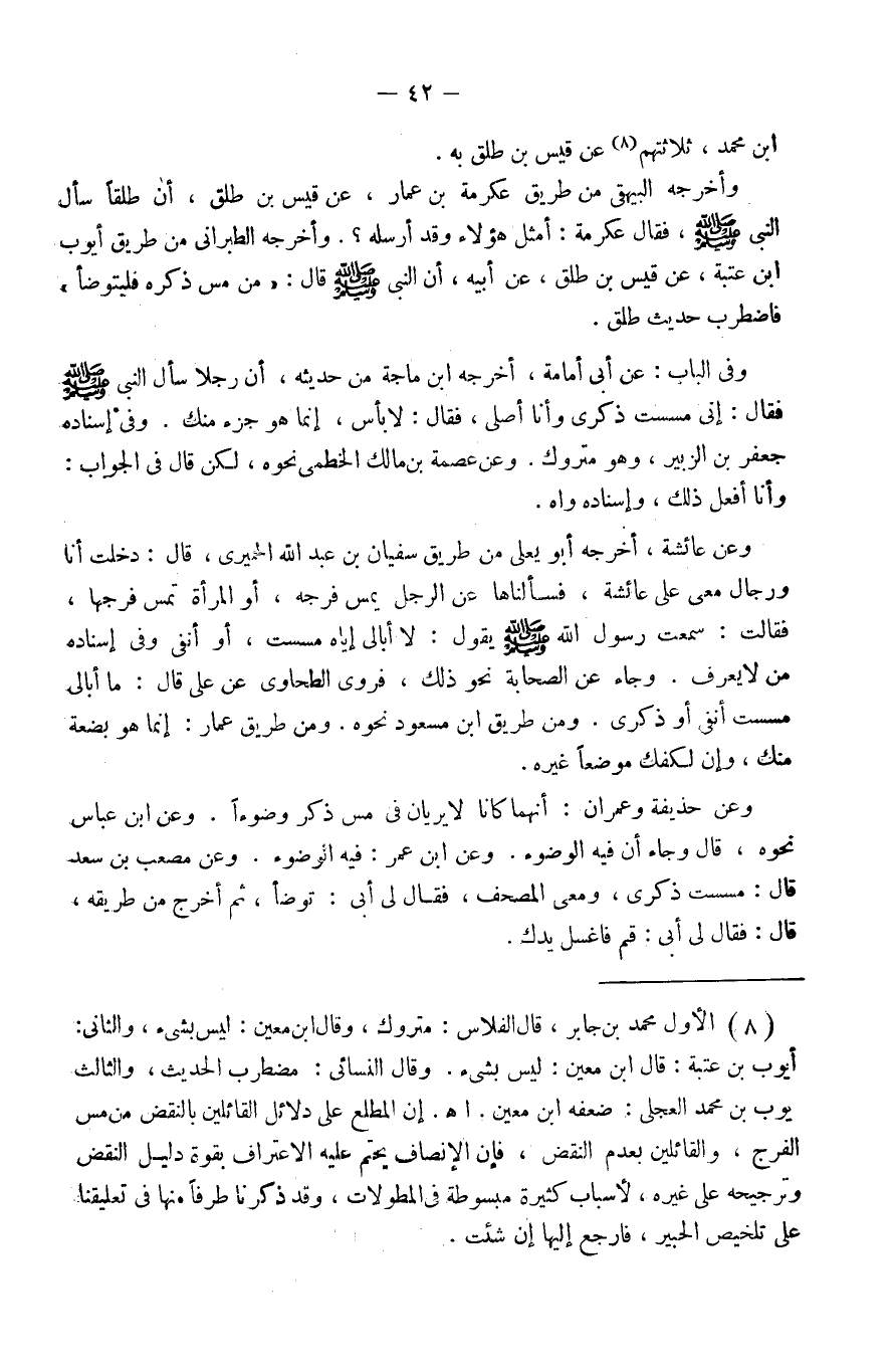 وَعَن حُذَيْفَة وَعمْرَان أَنَّهُمَا كَانَا لَا يريان فِي مس ذكر وضُوءًا وَعَن ابْن عَبَّاس نَحوه قَالَ وَجَاء أَن فِيهِ الْوضُوء وَعَن ابْن عمر فِيهِ الْوضُوء وَعَن مُصعب بن سعد قَالَ مسست ذكري وَمَعِي الْمُصحف فَقَالَ لي أبي تَوَضَّأ ثمَّ أخرج من طَرِيقه قَالَ فَقَالَ لي أبي قُم فاغسل يدك