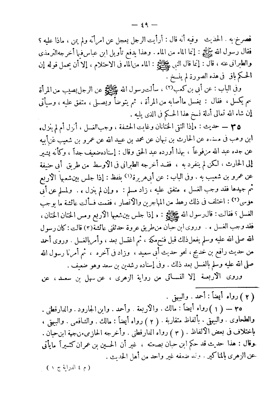 35 - حَدِيث إِذا التقَى الختانان وَغَابَتْ الْحَشَفَة وَجب الْغسْل أنزل أم لم ينزل ابْن وهب فِي مُسْنده عَن الْحَارِث بن نَبهَان عَن مُحَمَّد بن عبيد الله عَن عَمْرو بن شُعَيْب عَن أَبِيه عَن جده عبد الله مَرْفُوعا بِهَذَا أوردهُ عبد الْحق وَقَالَ إِسْنَاده ضَعِيف جدا وَكَأَنَّهُ يُشِير إِلَى الْحَارِث لَكِن لم ينْفَرد بِهِ فقد أخرجه الطَّبَرَانِيّ فِي الْأَوْسَط من طَرِيق أبي حنيفَة عَن عَمْرو بن شُعَيْب بِهِ وَفِي الْبَاب عَن أبي هُرَيْرَة بِلَفْظ إِذا جلس بَين شعبها الْأَرْبَع ثمَّ جهدها فقد وَجب الْغسْل مُتَّفق عَلَيْهِ زَاد مُسلم وَإِن لم ينزل وَلمُسلم عَن أبي مُوسَى إختلف فِي ذَلِك رَهْط من الْمُهَاجِرين وَالْأَنْصَار فَقُمْت فَسَأَلت عَائِشَة مَا يُوجب الْغسْل فَقَالَت قَالَ رَسُول الله صَلَّى اللَّهُ عَلَيْهِ وَسَلَّم َ إِذا جلس بَين شعبها الْأَرْبَع وَمَسّ الْخِتَان الْخِتَان فقد وَجب الْغسْل وَرَوَى ابْن حبَان من طَرِيق عُرْوَة حَدَّثتنِي عَائِشَة قَالَت كَانَ رَسُول الله صَلَّى اللَّهُ عَلَيْهِ وَسَلَّم َ يفعل ذَلِك قبل فتح مَكَّة ثمَّ اغْتسل بعد وَأمر بِالْغسْلِ وَرَوَى أَحْمد من حَدِيث رَافع بن خديج نَحْو حَدِيث أبي سعيد وَزَاد فِي آخِره ثمَّ أمرنَا رَسُول الله صَلَّى اللَّهُ عَلَيْهِ وَسَلَّم َ بِالْغسْلِ بعد ذَلِك وَفِي إِسْنَاده رشدين بن سعد وَهُوَ ضَعِيف