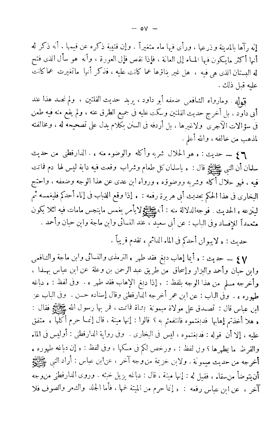 47 - حَدِيث أَيّمَا إهَاب دبغ فقد طهر التِّرْمِذِيّ وَالنَّسَائِيّ وَابْن ماجة وَالشَّافِعِيّ وَابْن حبَان وَأحمد وَالْبَزَّار وَإِسْحَاق من طَرِيق عبد الرَّحْمَن وَعلة عَن ابْن عَبَّاس بِهَذَا وَأخرجه مُسلم من هَذَا الْوَجْه بِلَفْظ إِذا دبغ الإهاب فقد طهر وَفِي لفظ دباغه طهوره وَفِي الْبَاب عَن ابْن عمر أخرجه الدَّارَقُطْنِيّ وَقَالَ إِسْنَاده حسن وَفِي الْبَاب عَن ابْن عَبَّاس قَالَ تصدق عَلَى مولاة ميمونه بِشَاة فَمَاتَتْ فَمر بهَا رَسُول اله صَلَّى اللَّهُ عَلَيْهِ وَسَلَّم َ فَقَالَ هلا أَخَذْتُم إهابها فدبغتموه فانتفعتم بِهِ قَالُوا إِنَّهَا ميتَة قَالَ إِنَّمَا حرم أكلهَا مُتَّفق عَلَيْهِ إِلَّا أَن قَوْله فدبغتموه لَيْسَ فِي البُخَارِيّ وَفِي رِوَايَة الدَّارَقُطْنِيّ أوليس فِي المَاء والقرط مَا يطهرها وَفِي لفظ وَرخّص لكم فِي مسكها وَفِي لفظ إِن دباغة طهوره أخرجه من حَدِيث ميمونه وَلابْن خُزَيْمَة من وَجه آخر عَن ابْن عَبَّاس أَرَادَ النَّبِي صَلَّى اللَّهُ عَلَيْهِ وَسَلَّم َ أَن يتَوَضَّأ من سقاء فَقيل لَهُ إِنَّهَا ميتَة قَالَ دباغه يزِيل خبثه وَرَوَى الدَّارَقُطْنِيّ من وَجه آخر عَن ابْن عَبَّاس رَفعه إِنَّمَا حرم الْميتَة لَحمهَا فَأَما الْجلد وَالشعر وَالصُّوف فَلَا
