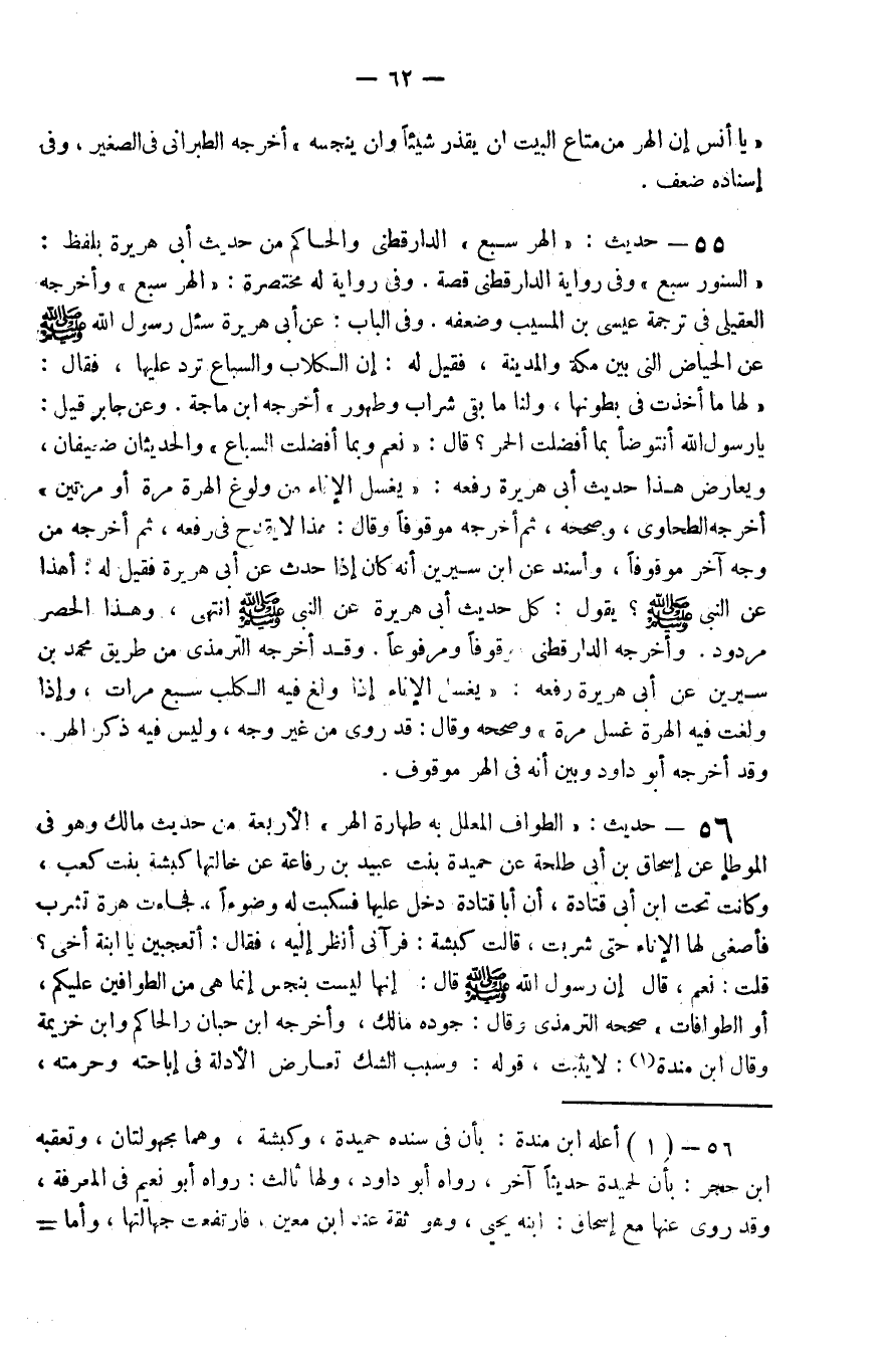 55 - حَدِيث الهر سبع الدَّارَقُطْنِيّ وَالْحَاكِم من حَدِيث أبي هُرَيْرَة بِلَفْظ السنور سبع وَفِي رِوَايَة الدَّارَقُطْنِيّ قصَّة وَفِي رِوَايَة لَهُ مختصرة الهر سبع وَأخرجه الْعقيلِيّ فِي تَرْجَمَة عِيسَى بن الْمسيب وَضَعفه وَفِي الْبَاب عَن أبي هُرَيْرَة سُئِلَ رَسُول الله صَلَّى اللَّهُ عَلَيْهِ وَسَلَّم َ عَن الْحِيَاض الَّتِي بَين مَكَّة وَالْمَدينَة فَقيل لَهُ إِن الْكلاب وَالسِّبَاع ترد عَلَيْهَا فَقَالَ لَهَا مَا أخذت فِي بطونها وَلنَا مَا بَقِي شراب وطهور أخرجه ابْن ماجة وَعَن جَابر قيل يَا رَسُول الله أَنَتَوَضَّأُ بِمَا أفضلت الْحمر قَالَ نعم وَبِمَا أفضلت السبَاع وَالْحَدِيثَانِ ضعيفان ويعارض هَذَا حَدِيث أبي هُرَيْرَة رَفعه يغسل الْإِنَاء من ولوغ الْهِرَّة مرّة أَو مرَّتَيْنِ أخرجه الطَّحَاوِيّ وَصَححهُ ثمَّ أخرجه مَوْقُوفا وَقَالَ هَذَا لَا يقْدَح فِي رَفعه ثمَّ أخرجه من وَجه آخر مَوْقُوفا وَأسْندَ عَن ابْن سِيرِين أَنه كَانَ إِذا حدث عَن أبي هُرَيْرَة فَقيل لَهُ أَهَذا عَن النَّبِي صَلَّى اللَّهُ عَلَيْهِ وَسَلَّم َ يَقُول كل حَدِيث أبي هُرَيْرَة عَن النَّبِي صَلَّى اللَّهُ عَلَيْهِ وَسَلَّم َ انْتَهَى وَهَذَا الْحصْر مَرْدُود وَأخرجه الدَّارَقُطْنِيّ مَوْقُوفا وَمَرْفُوعًا وَقد أخرجه التِّرْمِذِيّ من طَرِيق مُحَمَّد بن سِيرِين عَن أبي هُرَيْرَة رَفعه يغسل الْإِنَاء إِذا ولغَ فِيهِ الْكَلْب سبع مَرَّات وَإِذا ولغت فِيهِ الْهِرَّة غسل مرّة وَصَححهُ وَقَالَ قد رَوَى من غير وَجه وَلَيْسَ فِيهِ ذكر الهر وَقد أخرجه أَبُو دَاوُد وَبَين أَنه فِي الهر مَوْقُوف