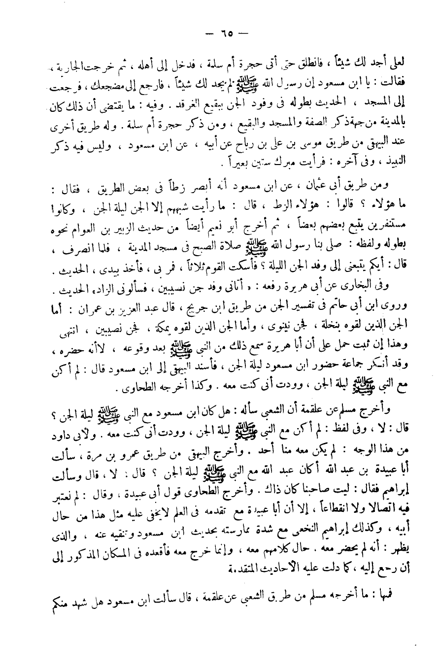وَأخرج مُسلم عَن عَلْقَمَة أَن الشّعبِيّ سَأَلَهُ هَل كَانَ ابْن مَسْعُود مَعَ النَّبِي صَلَّى اللَّهُ عَلَيْهِ وَسَلَّم َ لَيْلَة الْجِنّ قَالَ لَا وَفِي لفظ لم أكن مَعَ النَّبِي صَلَّى اللَّهُ عَلَيْهِ وَسَلَّم َ لَيْلَة الْجِنّ وودت أَنِّي كنت مَعَه وَلأبي دَاوُد من هَذَا الْوَجْه لم يكن مَعَه منا أحد وَأخرج الْبَيْهَقِيّ من طَرِيق عَمْرو بن مرّة سَأَلت أَبَا عُبَيْدَة بن عبد الله أَكَانَ عبد الله مَعَ النَّبِي صَلَّى اللَّهُ عَلَيْهِ وَسَلَّم َ لَيْلَة الْجِنّ قَالَ لَا قَالَ وَسَأَلت إِبْرَاهِيم فَقَالَ لَيْت صاحبنا كَانَ ذَاك وَأخرج الطَّحَاوِيّ قَول أبي عُبَيْدَة وَقَالَ لم نعتبر فِيهِ إتصالا وَلَا إنقطاعا إِلَّا أَن أَبَا عُبَيْدَة مَعَ تقدمه فِي الْعلم لَا يخفي عَلَيْهِ مثل هَذَا من حَال أَبِيه وَكَذَلِكَ إِبْرَاهِيم النَّخعِيّ مَعَ شدَّة ممارسته بِحَدِيث ابْن مَسْعُود وتنقيه عَنهُ وَالَّذِي يظْهر أَنه لم يحضر مَعَه حَال كَلَامهم مَعَه وَإِنَّمَا خرج مَعَه فأقعده فِي الْمَكَان الْمَذْكُور إِلَى أَن رَجَعَ إِلَيْهِ كَمَا دلّت عَلَيْهِ الْأَحَادِيث الْمُتَقَدّمَة