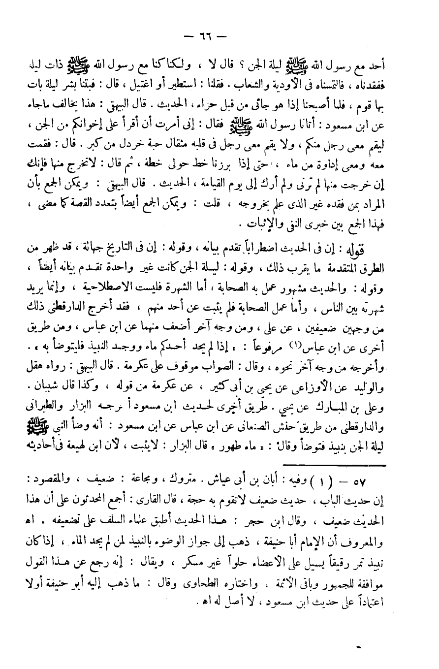 قَوْله إِن الحَدِيث اضطرابا تقدم بَيَانه وَقَوله إِن فِي التَّارِيخ جَهَالَة قد ظهر من الطّرق الْمُتَقَدّمَة مَا يقرب ذَلِك وَقَوله لَيْلَة الْجِنّ كَانَت غير وَاحِدَة تقدم بَيَانه أَيْضا وَقَوله والْحَدِيث مَشْهُور عمل بِهِ الصَّحَابَة أما الشُّهْرَة فَلَيْسَتْ الإصطلاحية وَإِنَّمَا يُرِيد شهرته بَين النَّاس وَأما عمل الصَّحَابَة فَلم يثبت عَن أحد مِنْهُم فقد أخرج الدَّارَقُطْنِيّ ذَلِك من وَجْهَيْن ضعيفين عَن عَلّي وَمن وَجه آخر أَضْعَف مِنْهُمَا عَن ابْن عَبَّاس وَمن طَرِيق أُخْرَى عَن ابْن عَبَّاس مَرْفُوعا إِذا لم يجد أحدكُم مَاء وَوجد النَّبِيذ فَليَتَوَضَّأ بِهِ وَأخرجه من وَجه آخر نَحوه وَقَالَ الصَّوَاب مَوْقُوف عَلَى عِكْرِمَة قَالَ الْبَيْهَقِيّ رَوَاهُ هِقْل والوليد عَن الأوزعي عَن يحي بن أبي كثير عَن عِكْرِمَة من قَوْله وَكَذَا قَالَ شَيبَان وَعلي بن الْمُبَارك عَن يحي طَرِيق أُخْرَى لحَدِيث ابْن مَسْعُود أخرجه الْبَزَّار وَالطَّبَرَانِيّ وَالدَّارَقُطْنِيّ من طَرِيق حَنش الصَّنْعَانِيّ عَن ابْن مَسْعُود أَنه وضأ النَّبِي صَلَّى اللَّهُ عَلَيْهِ وَسَلَّم َ لَيْلَة الْجِنّ بنبيذ فَتَوَضَّأ وَقَالَ مَاء طهُور قَالَ الْبَزَّار لَا يثبت لِأَن ابْن لَهِيعَة فِي أَحَادِيثه