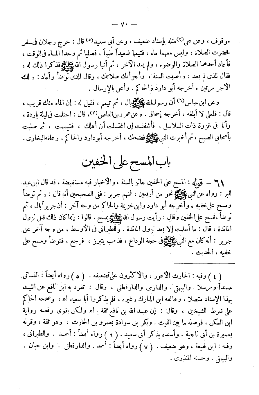 61 - قَوْله الْمسْح عَلَى الْخُفَّيْنِ جَائِزَة بِالسنةِ وَالْأَخْبَار فِيهِ مستفيضة قد قَالَ ابْن عبد الْبر رَوَاهُ النَّبِي صَلَّى اللَّهُ عَلَيْهِ وَسَلَّم َ نَحْو من أَرْبَعِينَ فَمنهمْ جرير فَفِي الصَّحِيحَيْنِ أَنه قَالَ ثمَّ تَوَضَّأ وَمسح عَلَى خفيه وَأخرجه أَبُو دَاوُد وَابْن خُزَيْمَة وَالْحَاكِم من وَجه آخر أَن جَرِيرًا بَال ثمَّ تَوَضَّأ فَمسح عَلَى الْخُفَّيْنِ وَقَالَ رَأَيْت رَسُول الله صَلَّى اللَّهُ عَلَيْهِ وَسَلَّم َ يمسح قَالُوا إِنَّمَا كَانَ ذَلِك قبل نزُول الْمَائِدَة قَالَ مَا أسلمت إِلَّا بعد نزُول الْمَائِدَة وللطبراني فِي الْأَوْسَط من وَجه آخر عَن جرير أَنه كَانَ مَعَ النَّبِي صَلَّى اللَّهُ عَلَيْهِ وَسَلَّم َ فِي حجَّة الْوَدَاع فَذهب يتبرز فَرجع فَتَوَضَّأ وَمسح عَلَى خفيه الحَدِيث
