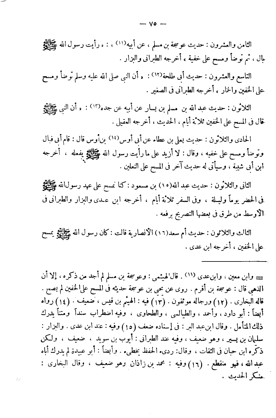 الثَّانِي وَالثَّلَاثُونَ حَدِيث عبد الله بن مَسْعُود كُنَّا نمسح عَلَى عهد رَسُول الله صَلَّى اللَّهُ عَلَيْهِ وَسَلَّم َ فِي الْحَضَر يَوْمًا وَلَيْلَة وَفِي السّفر ثَلَاثَة أَيَّام أخرجه ابْن عدي وَالْبَزَّار وَالطَّبَرَانِيّ فِي الْأَوْسَط من طرق فِي بَعْضهَا التَّصْرِيح بِرَفْعِهِ