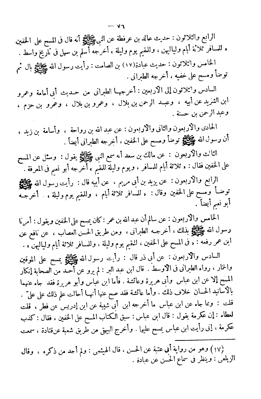 الْخَامِس وَالْأَرْبَعُونَ عَن سَالم أَن عبد الله بن عمر كَانَ يمسح عَلَى الْخُفَّيْنِ وَيَقُول أمرنَا رَسُول الله صَلَّى اللَّهُ عَلَيْهِ وَسَلَّم َ بذلك أخرجه الطَّبَرَانِيّ وَمن طَرِيق الْحسن العصاب عَن نَافِع عَن ابْن عمر رَفعه فِي الْمسْح عَلَى الْخُفَّيْنِ للمقيم يَوْم وَلَيْلَة وللمسافر ثَلَاثَة أَيَّام ولياليهن