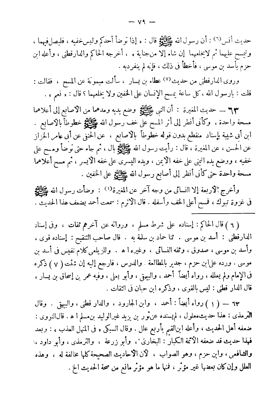 وَأخرج الْأَرْبَعَة إِلَّا النَّسَائِيّ من وَجه آخر عَن الْمُغيرَة وضأت رَسُول الله صَلَّى اللَّهُ عَلَيْهِ وَسَلَّم َ فِي غَزْوَة تَبُوك فَمسح أَعلَى الْخُف وأسفله قَالَ الْأَثْرَم سَمِعت أَحْمد يضعف هَذَا الحَدِيث