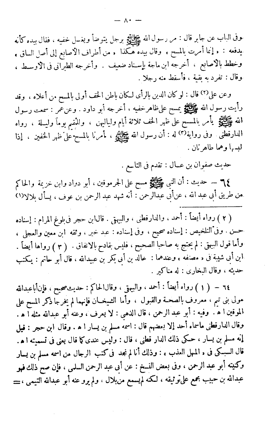 64 - حَدِيث أَن النَّبِي صَلَّى اللَّهُ عَلَيْهِ وَسَلَّم َ مسح عَلَى الجرموقين أَبُو دَاوُد وَابْن خُزَيْمَة وَالْحَاكِم من طَرِيق أبي عبد الله عَن أبي عبد الرَّحْمَن أَنه شهد عبد الرَّحْمَن بن عَوْف يسْأَل بِلَالًا