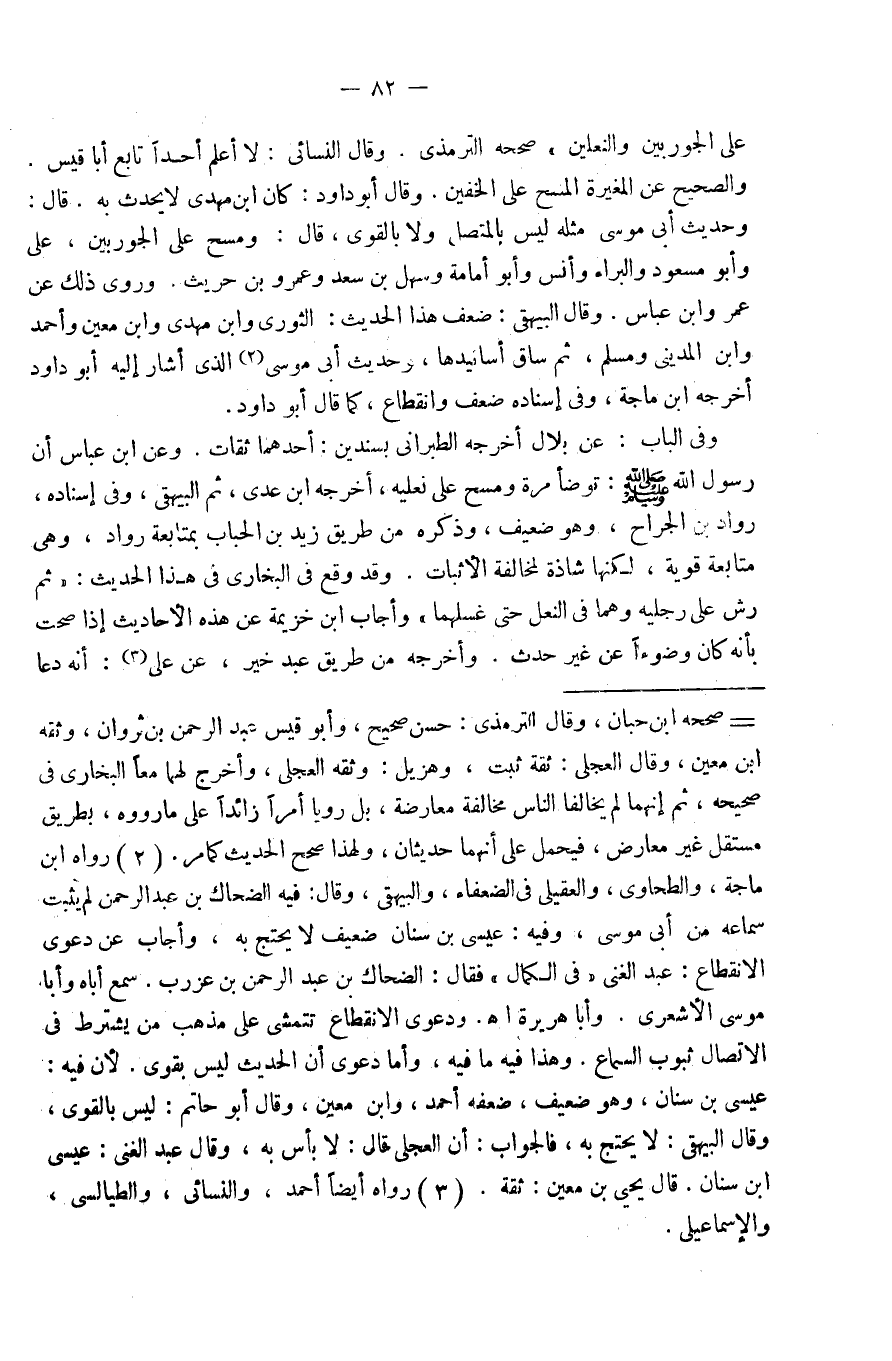عَلَى الجوربين والنعلين صَححهُ التِّرْمِذِيّ وَقَالَ النَّسَائِيّ لَا أعلم أحدا تَابع أَبَا قيس وَالصَّحِيح عَن الْمُغيرَة الْمسْح عَلَى الْخُفَّيْنِ وَقَالَ أَبُو دَاوُد كَانَ ابْن مهْدي لَا يحدث بِهِ قَالَ وَحَدِيث أبي مُوسَى مثله لَيْسَ بالمتصل وَلَا بِالْقَوِيّ قَالَ وَمسح عَلَى الجوربين عَلّي وَأَبُو مَسْعُود والبراء وَأنس وَأَبُو أُمَامَة وَسَهل بن سعد وَعَمْرو بن حُرَيْث وَرَوَى ذَلِك عَن عمر وَابْن عَبَّاس وَقَالَ الْبَيْهَقِيّ ضعف هَذَا الحَدِيث الثَّوْريّ وَابْن مهْدي وَابْن معِين وَأحمد وَابْن الْمَدِينِيّ وَمُسلم ثمَّ سَاق أسانيدها وَحَدِيث أبي مُوسَى الَّذِي أَشَارَ إِلَيْهِ أَبُو دَاوُد أخرجه ابْن ماجة وَفِي إِسْنَاده ضعف وإنقطاع كَمَا قَالَ أَبُو دَاوُد